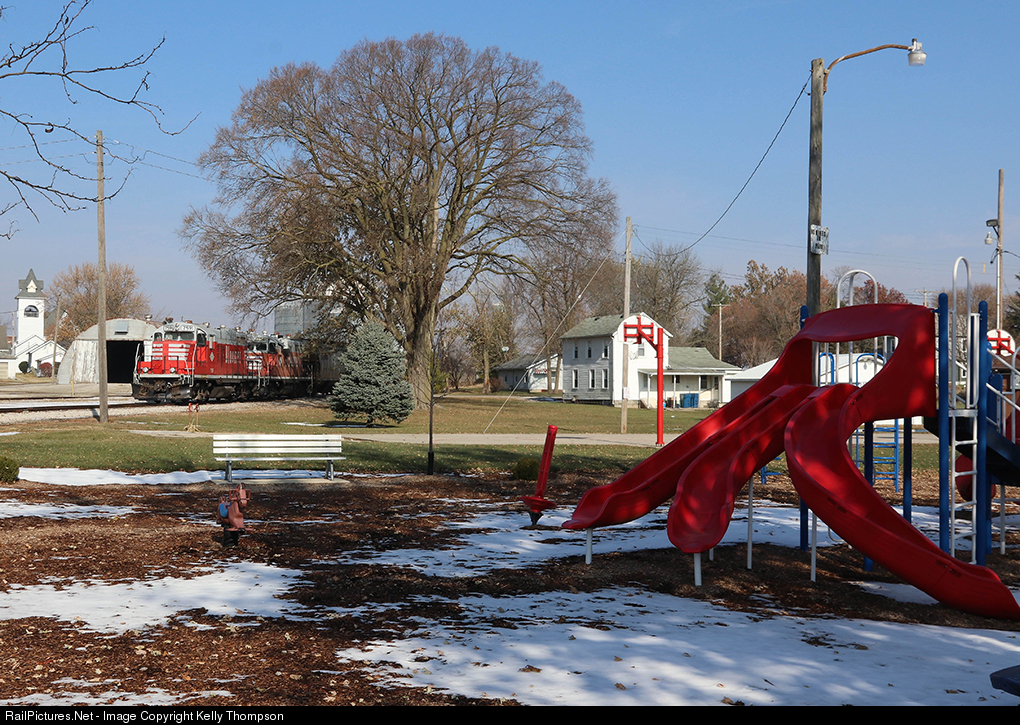 BLOL 7591 pulls through Cullom with 25 grain loads. Here they are passing the nice park set up around downtown.
