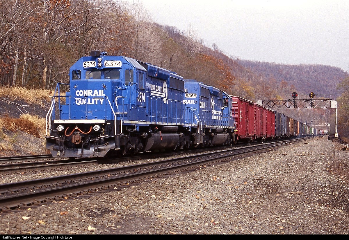 As with their westbound counterparts, nearly every tonnage train descending the mountain has helpers on the rear to assist with braking. The 6366/6374 set is coupled to the 6256 East, PIBA, as it passes the home signals for MG on an early November morning. Ektachrome.