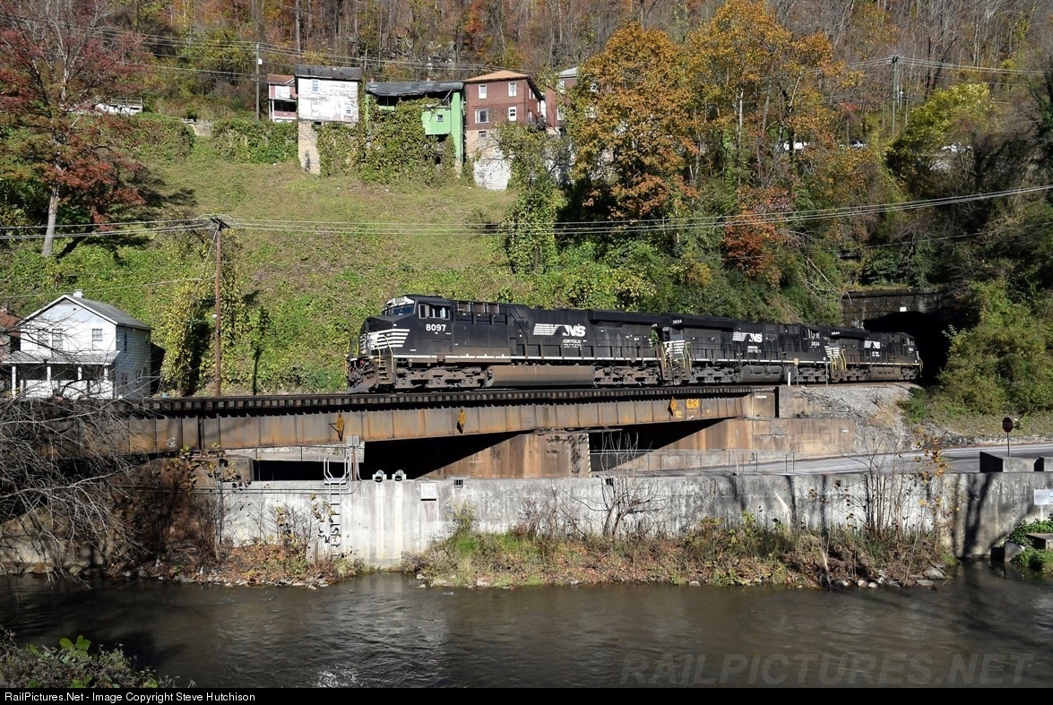 | 8097 leads a pusher set westbound out of Welch Tunnel and over the Tug River. They are headed to the west end of Farm where they will couple onto an eastbound train to assist with the climb up the Elkhorn grade to Bluefield. |