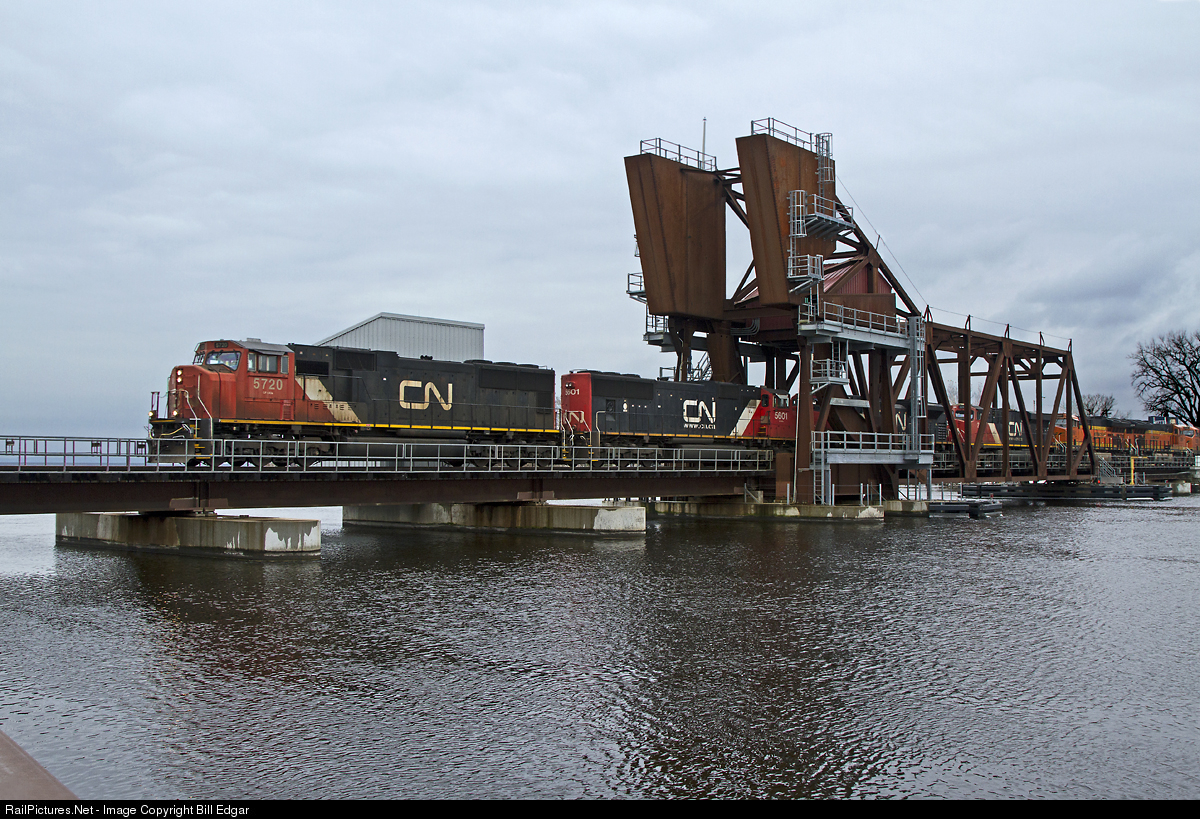 | CN 5720 and three more CN units lead a trio of BNSF GEs as their seven unit consist rolls north through Oshkosh, WI crossing the Fox River draw bridge. Behind the bridge lies Lake Winnebago, Wisconsin's largest inland lake. |