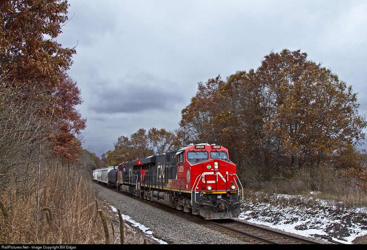 | CN 3829 and mate haul manifest westward as they slow to enter the siding at Amherst, WI for a meet. They will get tucked in as the eastbound train rolls down the main, making for a quick meet. The oak trees refuse to give up their tuscan leaves in a typically November scene. |