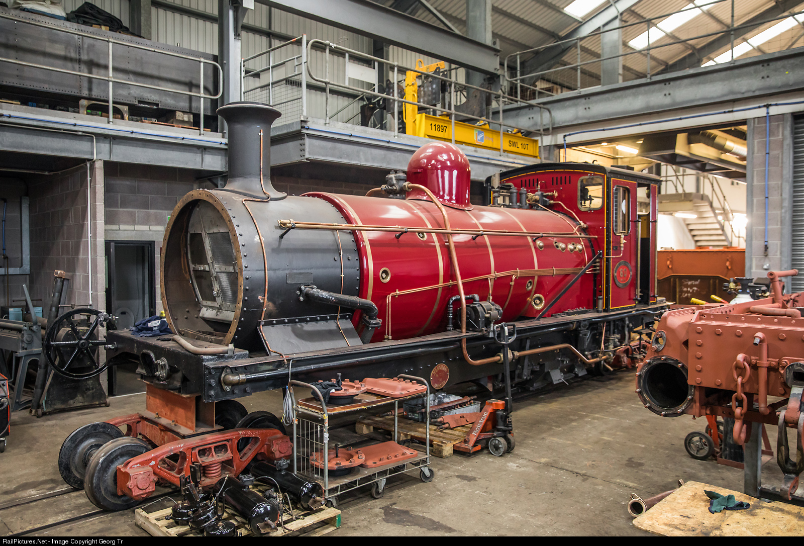 The newest acquisition of the Vale of Rheidol Railway is this NGG (Narrow Gauge Garratt) 13 # 60 "Drakensberg", which came in 2017 from the Schinznacher Baumschulbahn in Switzerland. This locomotive was built by Hanomag/Germany in 1927. Frame, boiler and cab are seen in the workshop of Aberystwyth in revision.