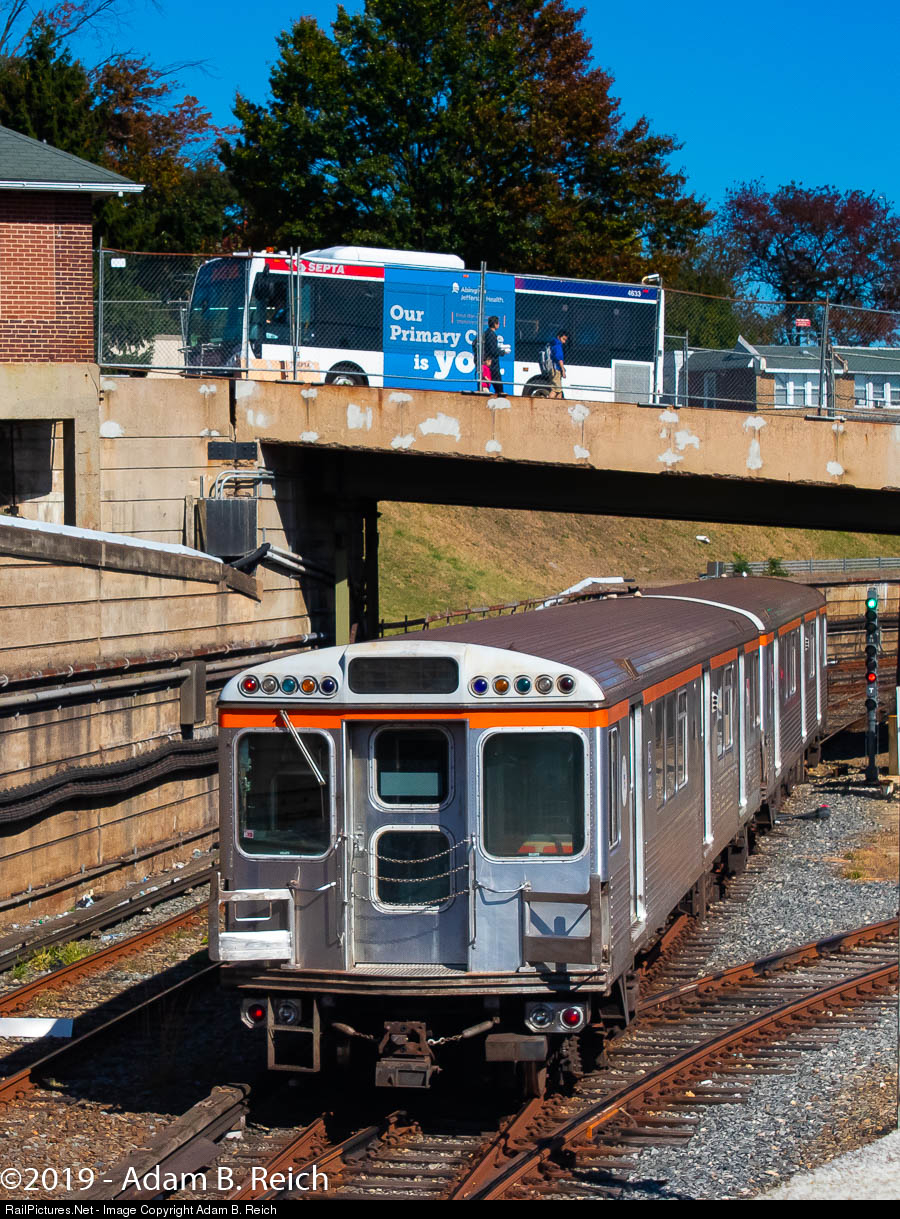Fern Rock Crossing: A two-car SEPTA train passes over a switch track to the Fern Rock Yard and Maintenance Facility and under a SEPTA bus as it approaches its final stop at the Fern Rock Transportation Center on Saturday October 19, 2019. Photo taken while on the property with permission for SEPTA’s 2019 Rail Rodeo.