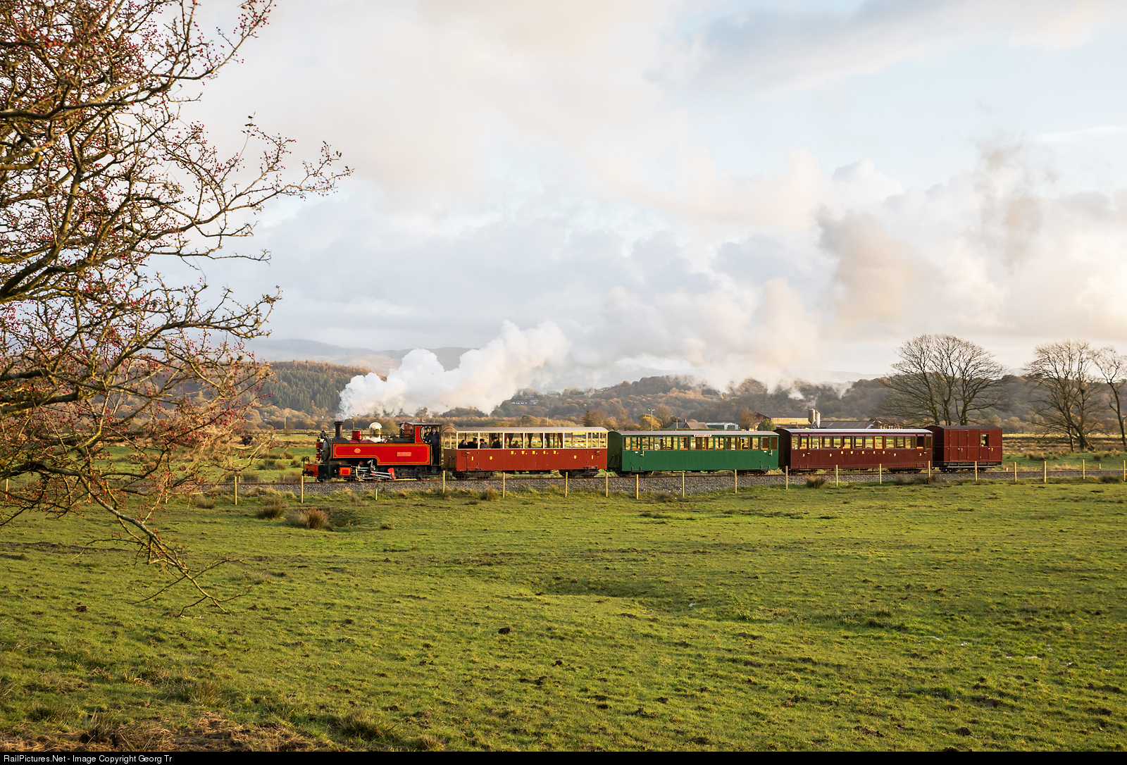 2-6-2 T steamlocomotive "Russell" of the Welsh Highland Heritage Railway (WHHR) is pulling a photo charter train between Pont Croesor and Nantmor on the Welsh Highland Railway. This locomotive was built in 1906 for the North Wales Narrow Gauge Railways (NWNGR) by the Hunslet Engine Company and was named after the Chairman, Managing Director and second receiver of that company. In 1922 it became the property of the Welsh Highland Railway (WHR) along with the NWNGR. 1937 the WHR closed, with Russell running the last through train. After a very interesting history the "Russell" is operational again since 2013 for the Welsh Highland Heritage Railway, but is usually circulating on the about 1 mile long track of this company only. The cars in the train are: Central glazed saloon with open balcony at each end, # 8, built in 1891, the 'Gladstone Car' Ex North Wales Narrow Gauge Railways recovered 1988 and restored by WHR Ltd. Green 'Buffet Car', built 1893, without written number # 10. This carriage was initially given the number "23" in the combined FR/WHR stock list. However, there is documentary evidence that the carriage was formally identified as "No. 24" in 1936. It appears that this number change occurred in 1926 when the WHR exchanged one of their Ashbury "Summer" carriages (No 24) with the FR in return for three bogie coal wagons. The carriage was modified by the WHR in 1927 to serve as a buffet car, a service which operated until 1929. It was recovered in 1987 and restored by Stanegate Restorations and Replicas Ltd and WHHR ltd with its first run in the heritage train on 2 May 2009. Brown car # 9 Ashbury ‘Corridor’ (sometimes referred to as the ‘Scout Coach’) Replica from 2010 of original 1893 carriage. Brake van # 2 built in 1902, Ex. G.W.R. Vale of Rheidol Railway four-wheeled van, sold by British Rail 1968.