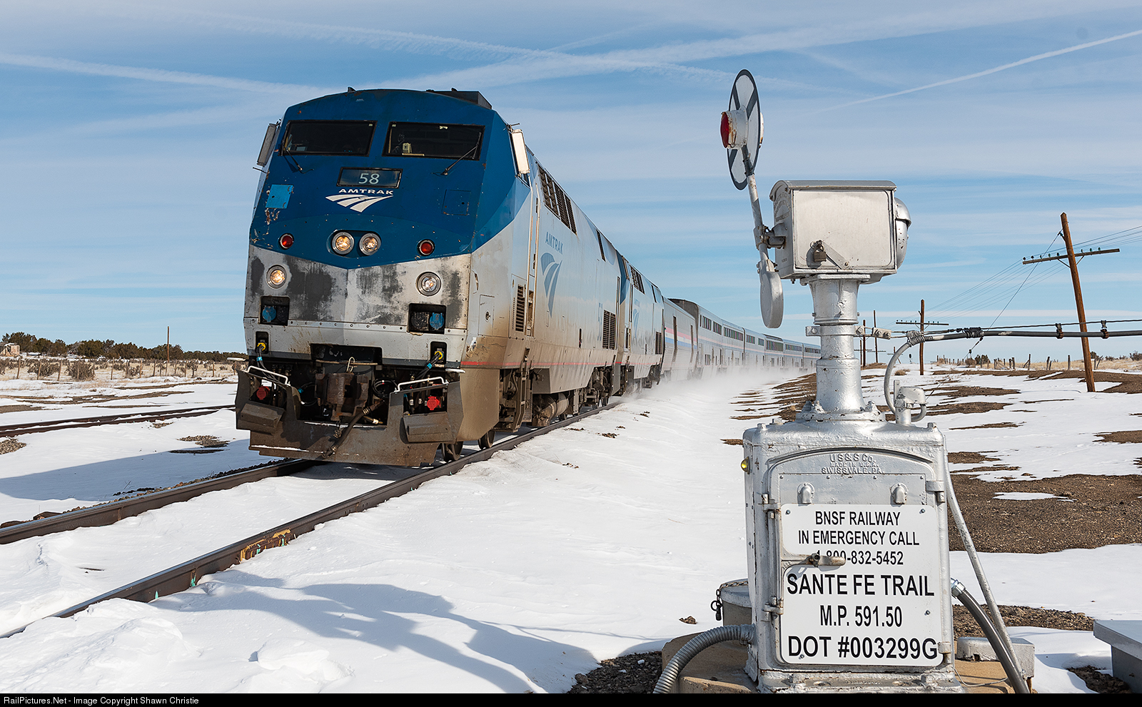 | The westbound Amtrak Southwest Chief passes the Magnetic Flagman in Delhi, Colorado, an icon along the BNSF Raton Subdivision as the last Wigwag along a class I railroad still in mainline operation. |