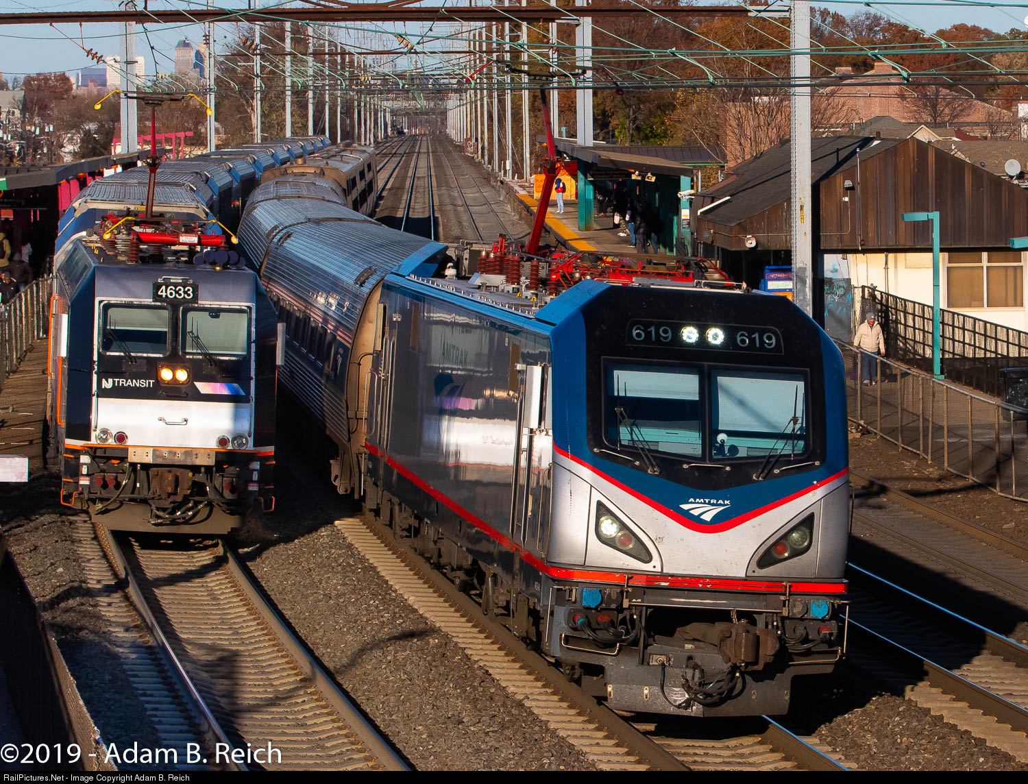 | Crescent Eclipse: The Crescent, Train #19, passes a Trenton-bound NJ Transit Train at Elizabeth Station on Saturday, November 16, 2019. |