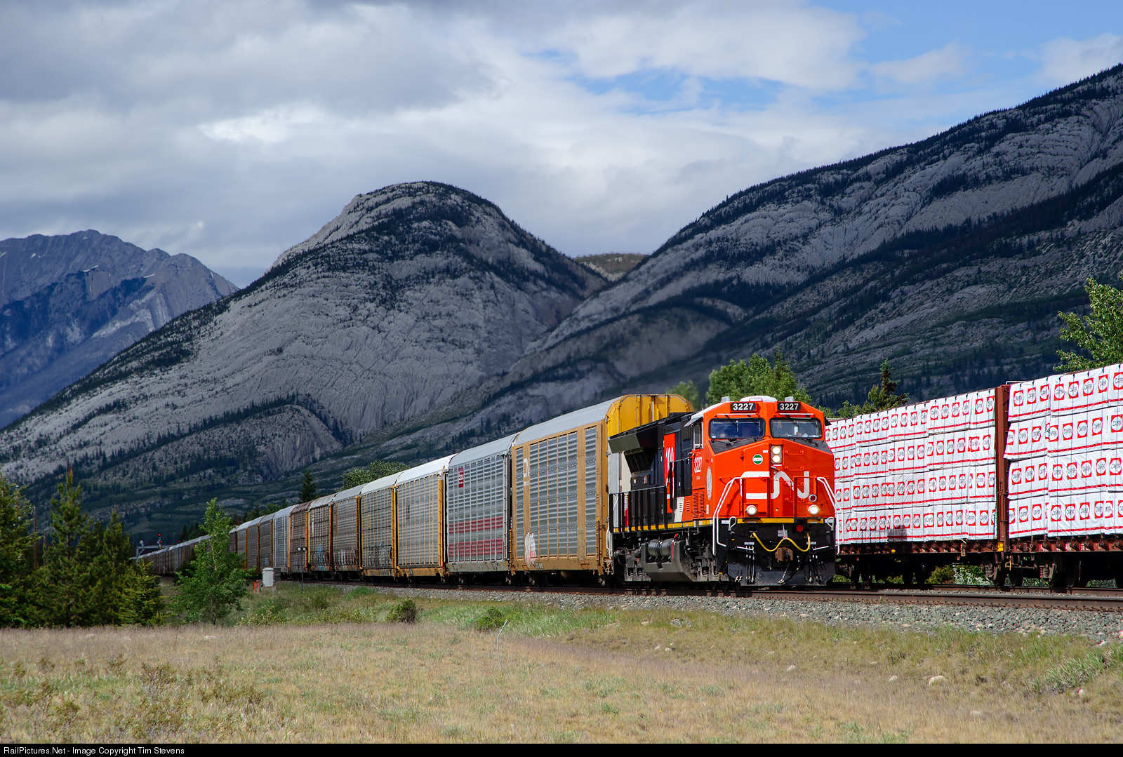 Brand new CN ET44AC 3227 leads an empty rack train towards Jasper.