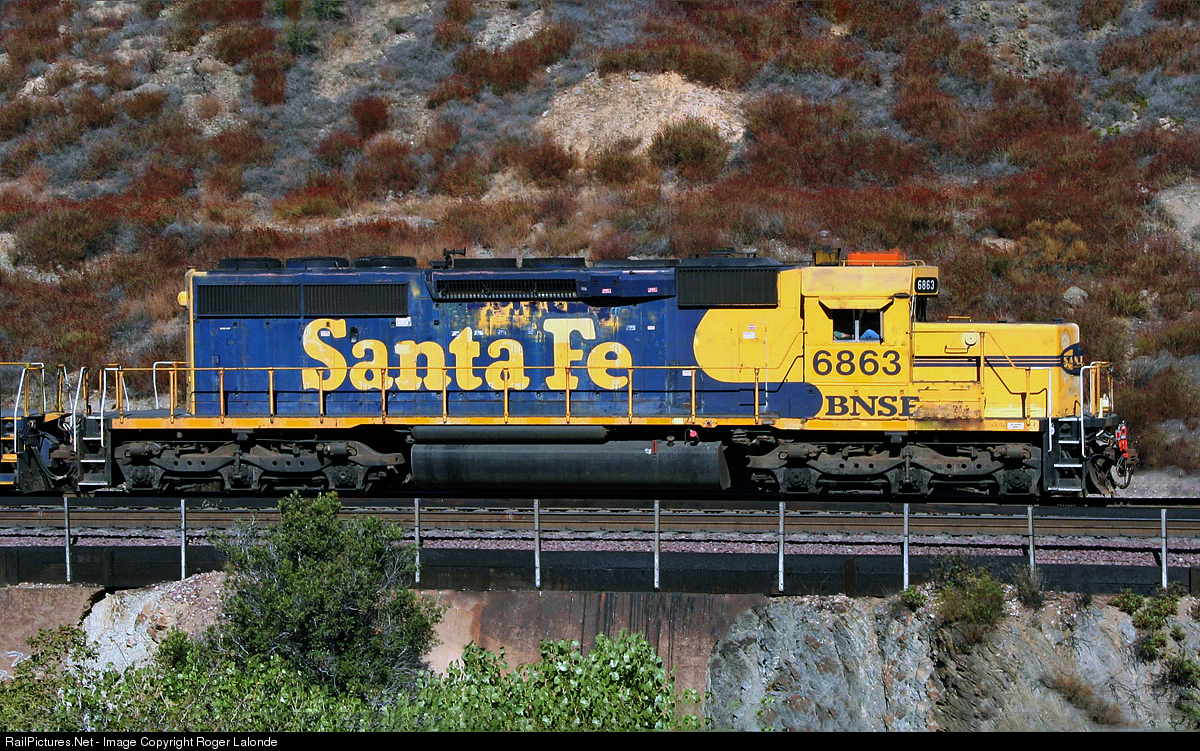 | BNSF SD40-2 6863 former ATSF 5134, working helper duty, at Cajon Pass. |