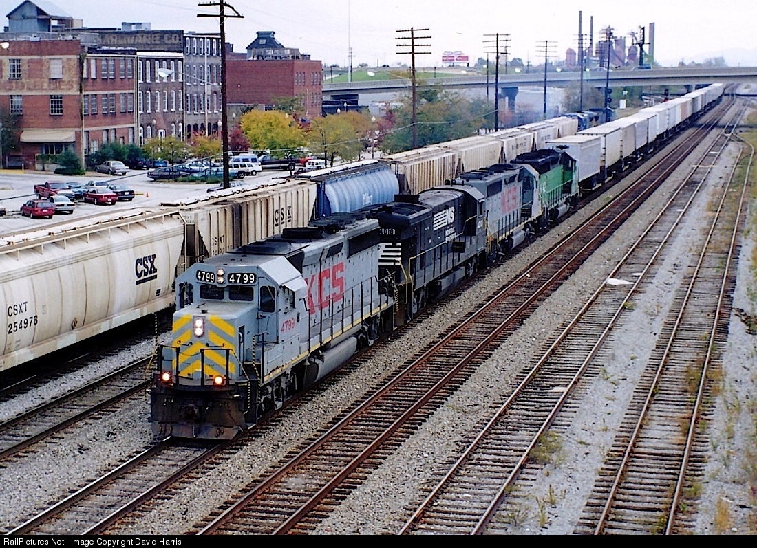 A KCS/NS runthrough heads west through downtown Birmingham behind a pair of GP40-3s bracketing a Norfolk Southern B23-7. Bringing up the rear is an ex-BN/BNSF GP40 that will soon get the Dash-3 redo. KCS used a variety of GP40s from other roads in their GP40-3 program, but 4799 started life as KCS GP40-2 799, delivered in August 1979.