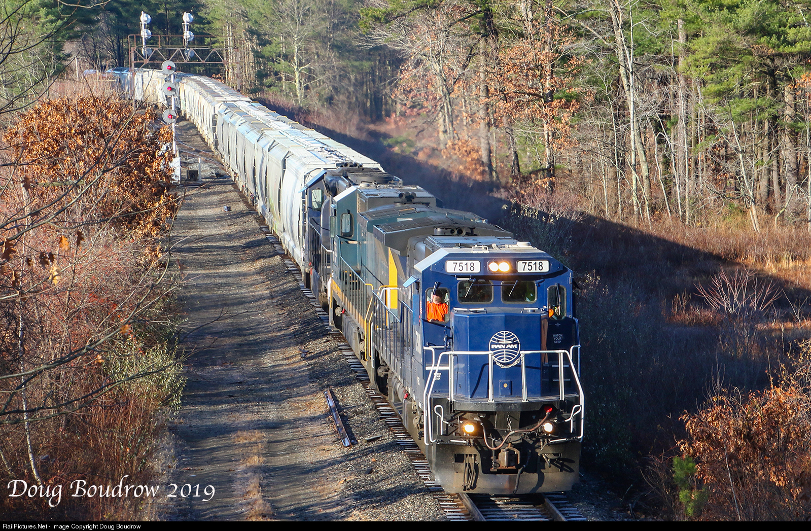 | Pan Am EDPO (East Deerfield, MA to Portland, ME) is seen passing CPF (Control Point Freight) 312 in Littleton, MA.