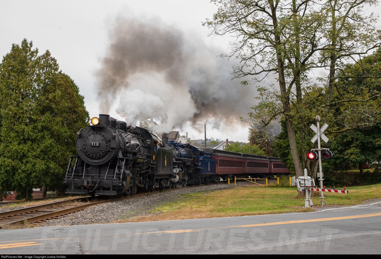| With the MVSH tied onto the head end of the PNSH, CNJ 113 and RBMN 425 roll through Landingville, PA en route to the Schuylkill Haven Borough Day festival |