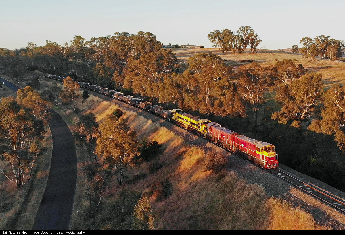 A nice rare late afternoon departure from Bendigo to Tottenham sees 9042 empty spoil train race through Harcourt as the shadows grow long just before sunset. P17, P18, T386 & T385 provide a nice combination of power with the locos all being required in Melbourne for works trains.