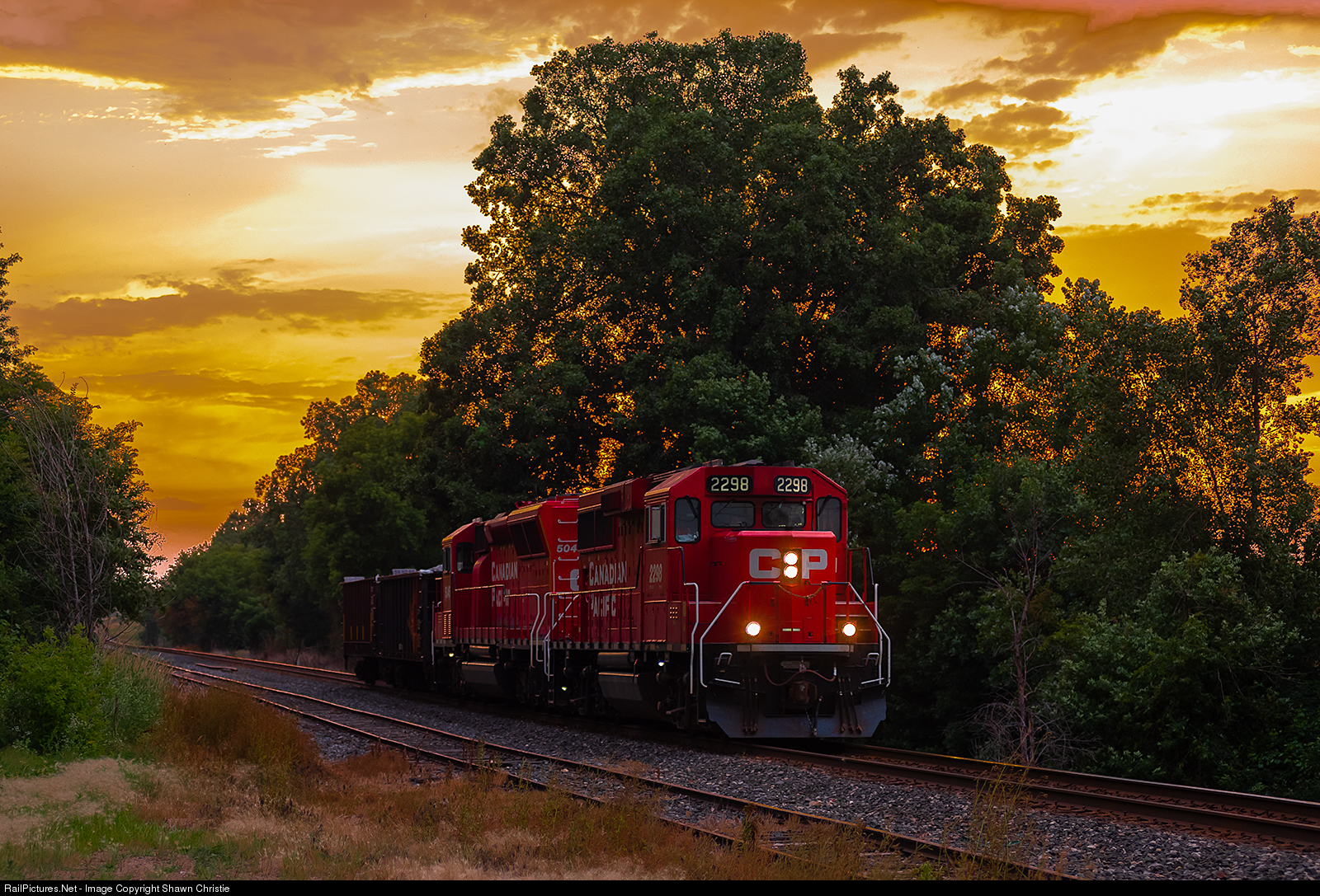 | After working in Rockford, CP local H55 heads toward to Minneapolis. A couple small passing evening t-storms helped produce a spectacular sunset as CP 2298 leads the way through Hamel, MN. |