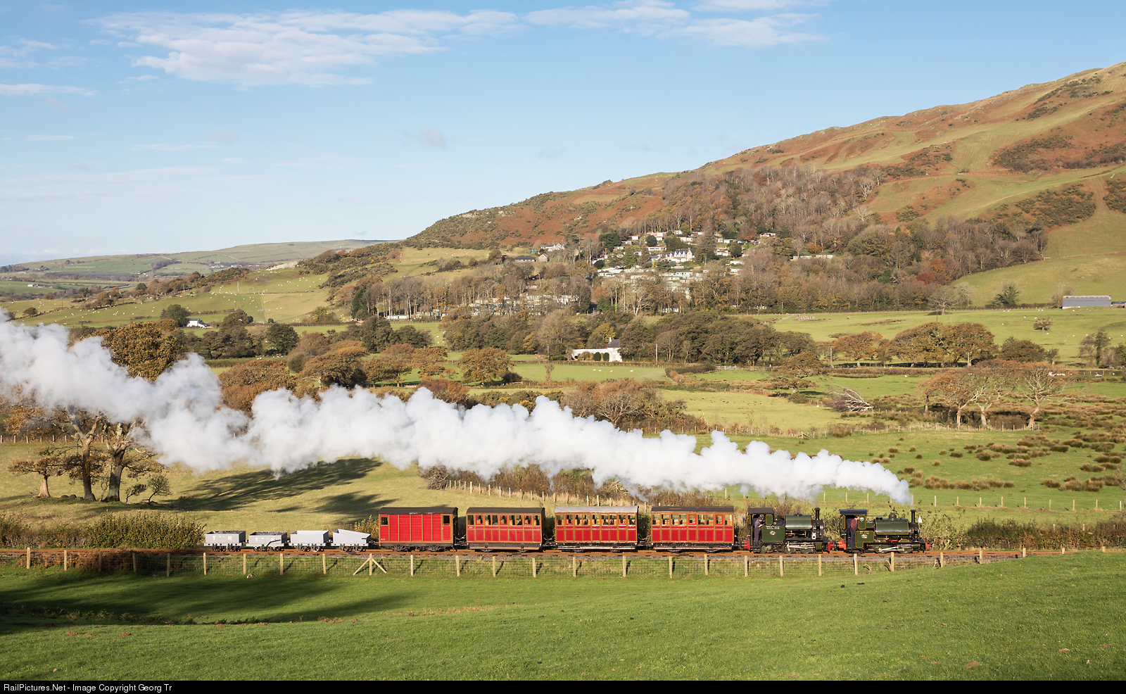 0-4-2 saddle tank steamlocomotives # 3 SIR HAYDN and # 4 "EDWARD THOMAS" are pulling a mixed train on the 2 ft 3 in (686 mm) gauge Talyllyn Railway between Rhydyronen and Brynglas. In the rear of the train are 4 empty slate transport wagons. This was the main load of the railway, which openend in 1866. The railway opened with two locomotives, one carriage and several goods vehicles in use and was operated under a "one engine in steam" policy to ensure that two trains could not collide. Locomotive # 3 was built in 1878 by Hughes’ Loco & Tramway Eng. Works Ltd of Loughborough for the Corris Railway and came to the Talyllyn in 1951. # 4 was built in 1921 by Kerr, Stuart & Co. Ltd. for use on the Corris Railway, and was purchased by the Talyllyn in 1951 and named after the TR’s former manager.