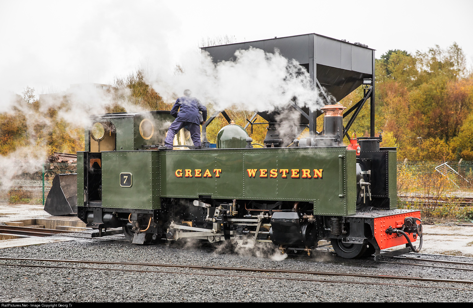 2-6-2 T steamlocomotive # 7 of the Vale of Rheidol Railway in Aberystwyth at the brand new coal tower. The locomotive was built in 1923 at Great Western Railway’s Swindon works alongside sister locomotive No 8. They were designed to replace locomotives supplied at the opening of the Vale of Rheidol by Davies & Metcalfe, which when the Great Western took over were worn out. They, with their sister 1213, are the most powerful non-articulated tank engines on two foot gauge operating in the world. # 7 returned to steam in October 2018 after four years of hard work by a dedicated team of engineers.