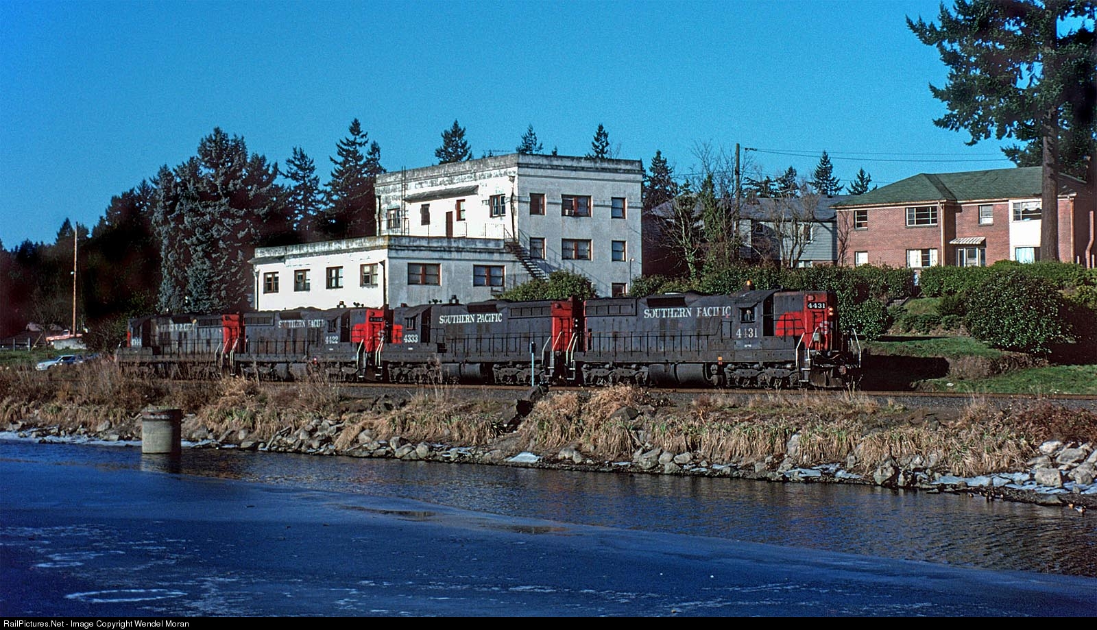 | The Clackamas Switcher is running eastbound on the Tillamook Branch during a cold winter day. The large white apartment building in the background was originally built as a substation for SP's Red Electric interurban service. |