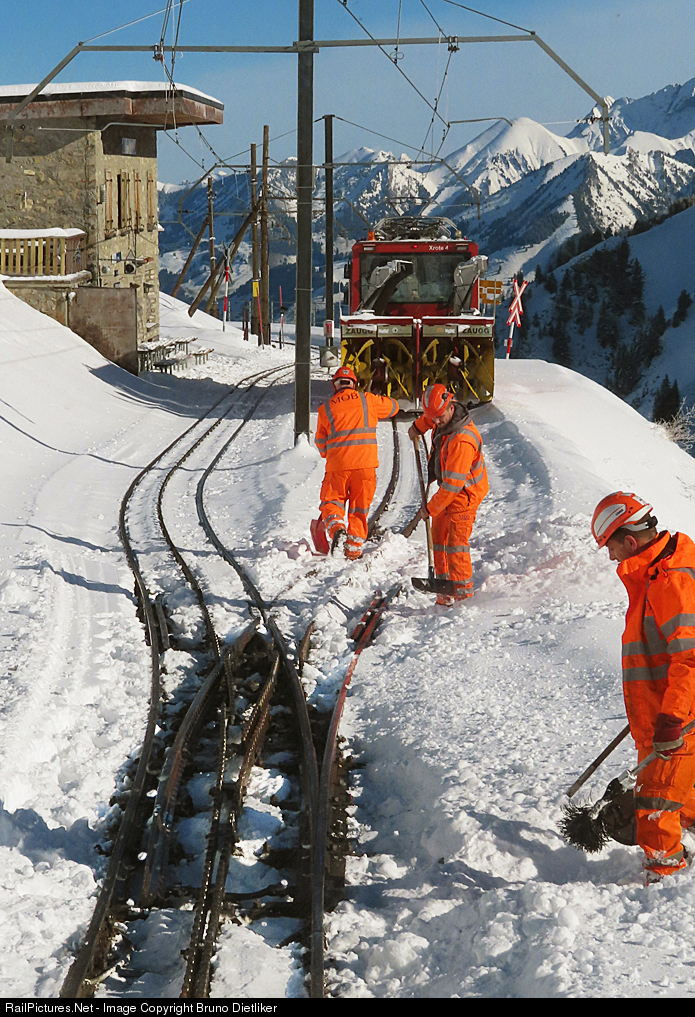 | Snow, workers and snowplow seen through the cab at the rear of the train Montreux - Rochers de Naye. Left the small station building from the station Jaman (1742m asl) |