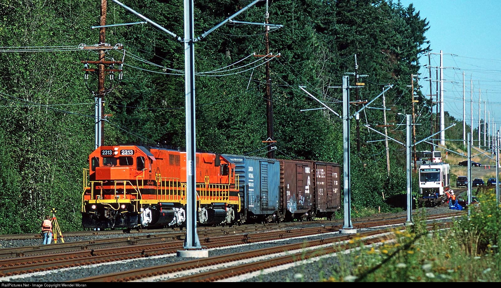 | When Portland & Western started operating, they inherited a GM Parts Distribution Center as a customer on the former Oregon Electric. The light rail project to Portland's west suburbs was built on the old OE main line grade. Trackage to the GM facility paralleled the light rail line for a distance. In this image, a train is preparing to head up the spur to the shipper. In the distance, a light rail vehicle is being unloaded from a flatcar. |