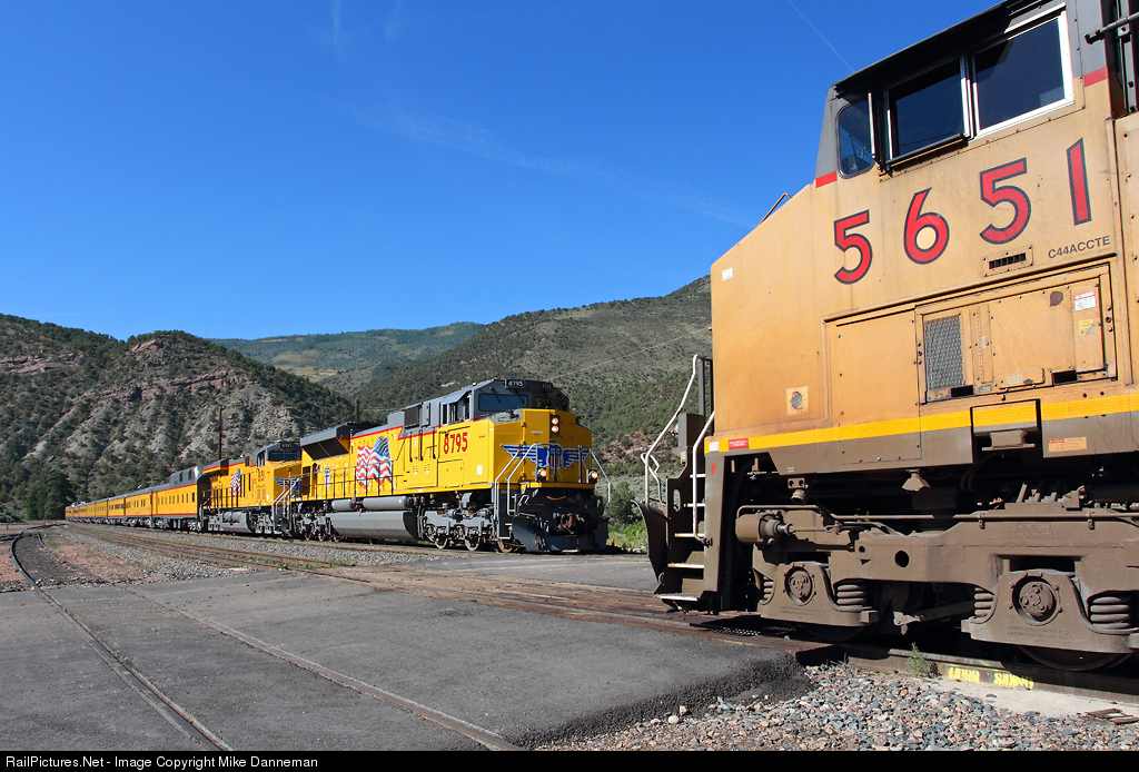 A westbound Union Pacific passenger train pauses at the crew change of Bond, Colorado, before heading west on the Dotsero Cutoff on UP’s Glenwood Canyon Subdivision on August 3, 2014. UP’s MRONY led by GE AC4400CW-CTE No. 5651 also waits for a fresh crew before heading east toward Denver.