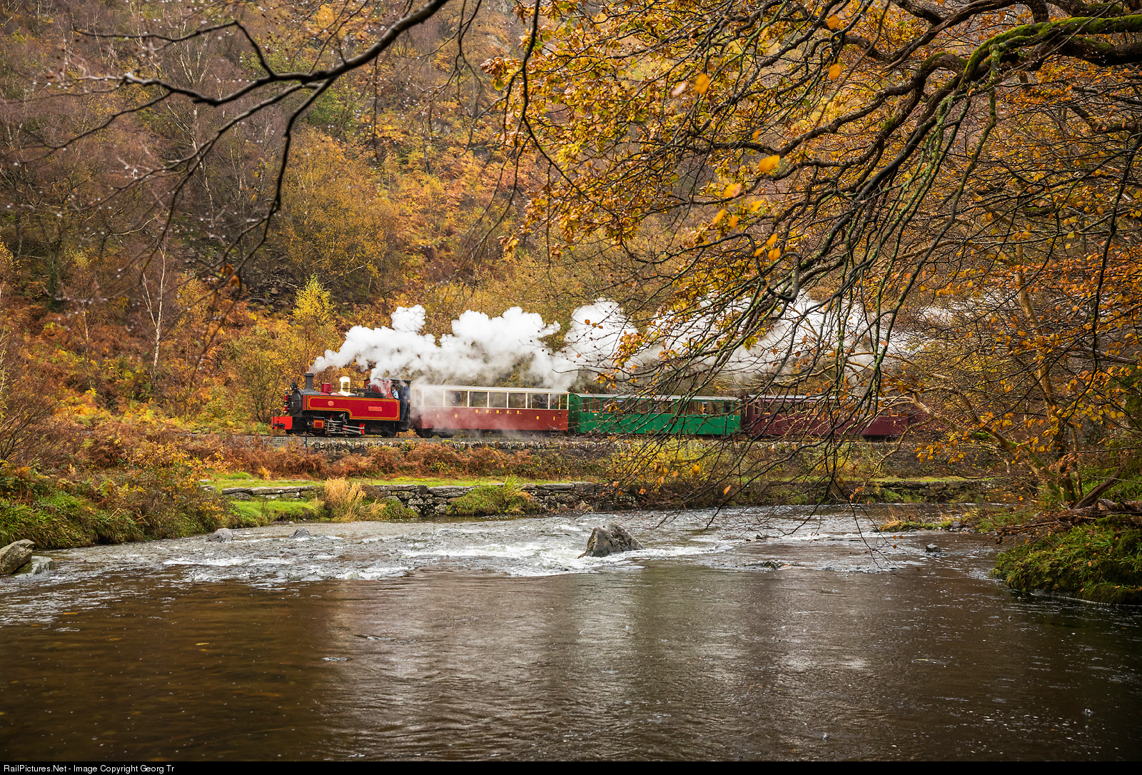 | The 2-6-2 T steamlocomotive "Russell" of the Welsh Highland Heritage Railway is running along the Afon Glaslyn with a photo charter train for FarRail Tours. "Russell" was built in 1906 by Hunslet and is the only surviving original WHR engine. Returned to steam following overhaul in August 2014. |