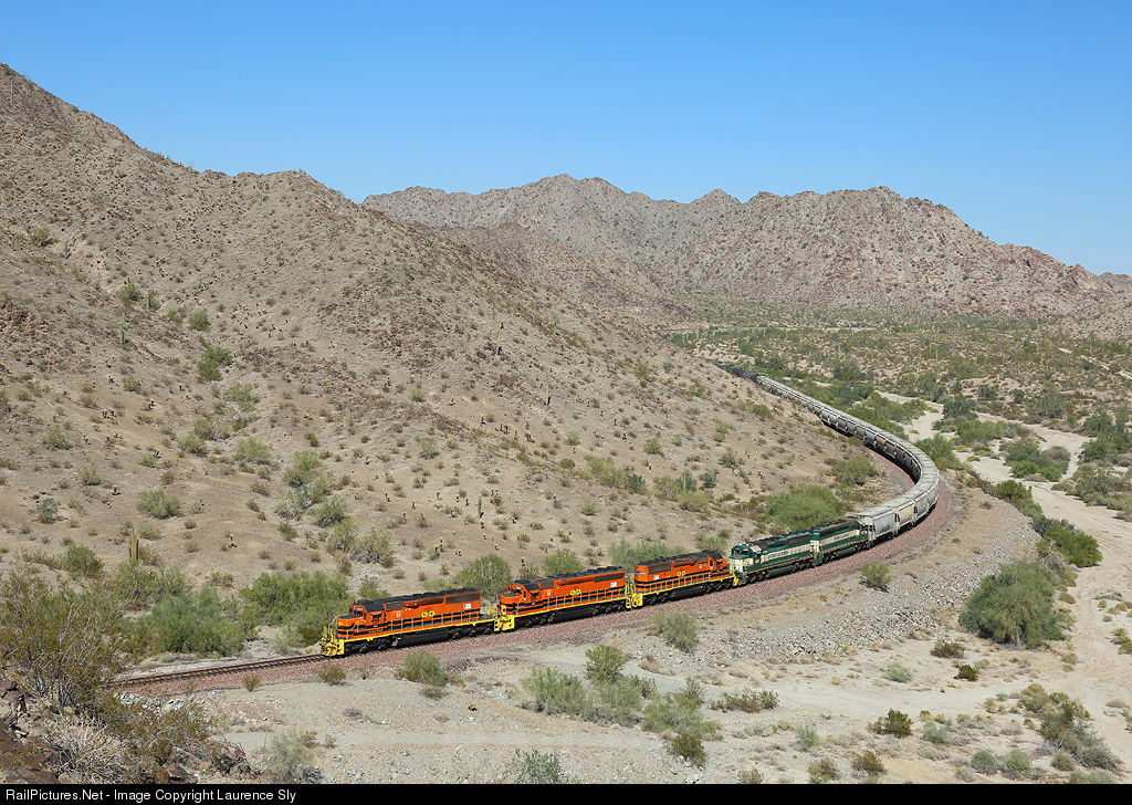 | After interchanging with BNSF at Castle Hot Springs, 3999, 3997, 3998, 4001 & 4002 pass Hope on their way to Parker |