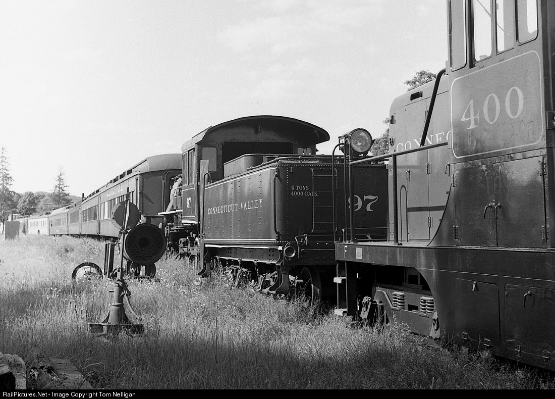 This looks like a string of abandoned equipment, but in fact it's the opposite. A year before Connecticut's Valley Railroad began operation on a former New Haven branchline, organizers had gathered startup equipment including GE 44-Tonner 400, 2-8-0 97, and a collection of passenger cars in the Essex, CT, yard. Steam trains would begin running here the following summer.