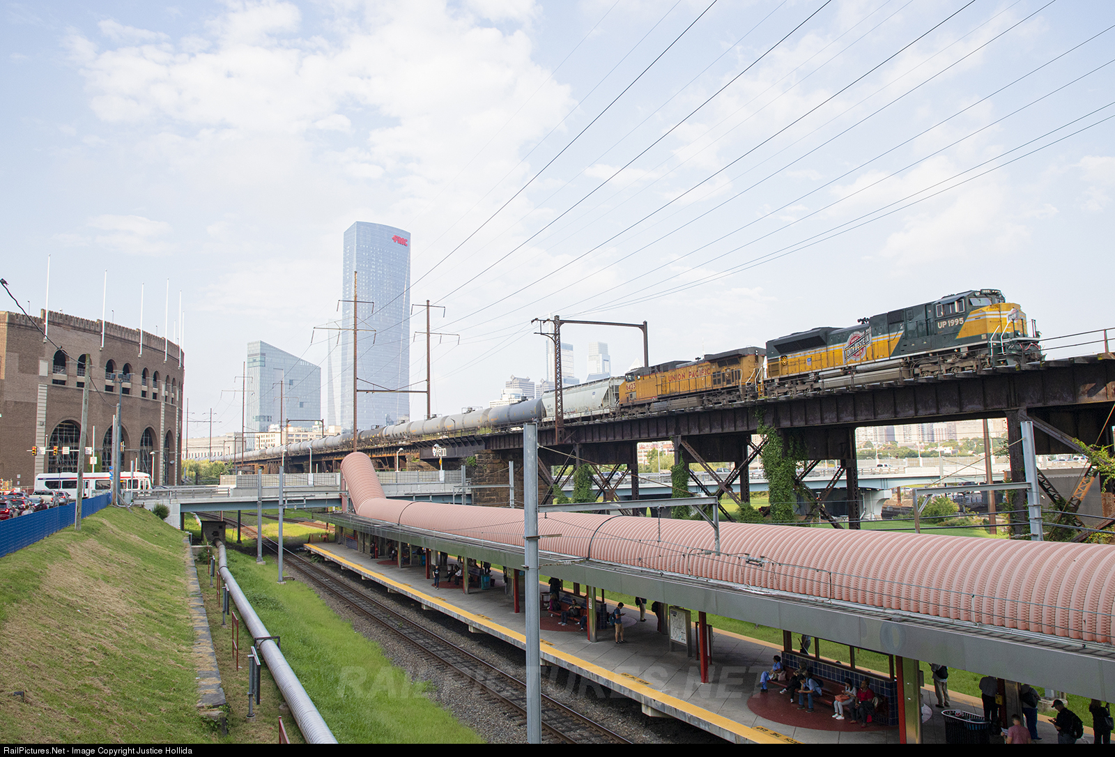 | A rather unusual sight for the "High Line" in downtown Philadelphia. A pair of Union Pacific motors led by the Chicago & Northwestern heritage unit snakes a lengthy ethanol train through town. |