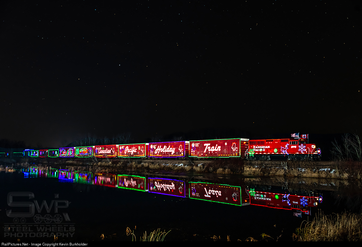 Another night to apply technical expertise with some off camera flash photography! The Canadian Pacific Railway 2019 US Holiday Train is deadheading to Albany, NY after playing its opening acts between Montreal and Lacolle, Quebec. Seen as it traverses the CP Canadian Mainline at Port Henry, NY, the lack of moon and low light emission settings from the flash allowed the illumination of the train to stand out, as well as quite a few stars overhead! This is the CP 01H-25 Holiday Train with GP22C-ECO #2246.