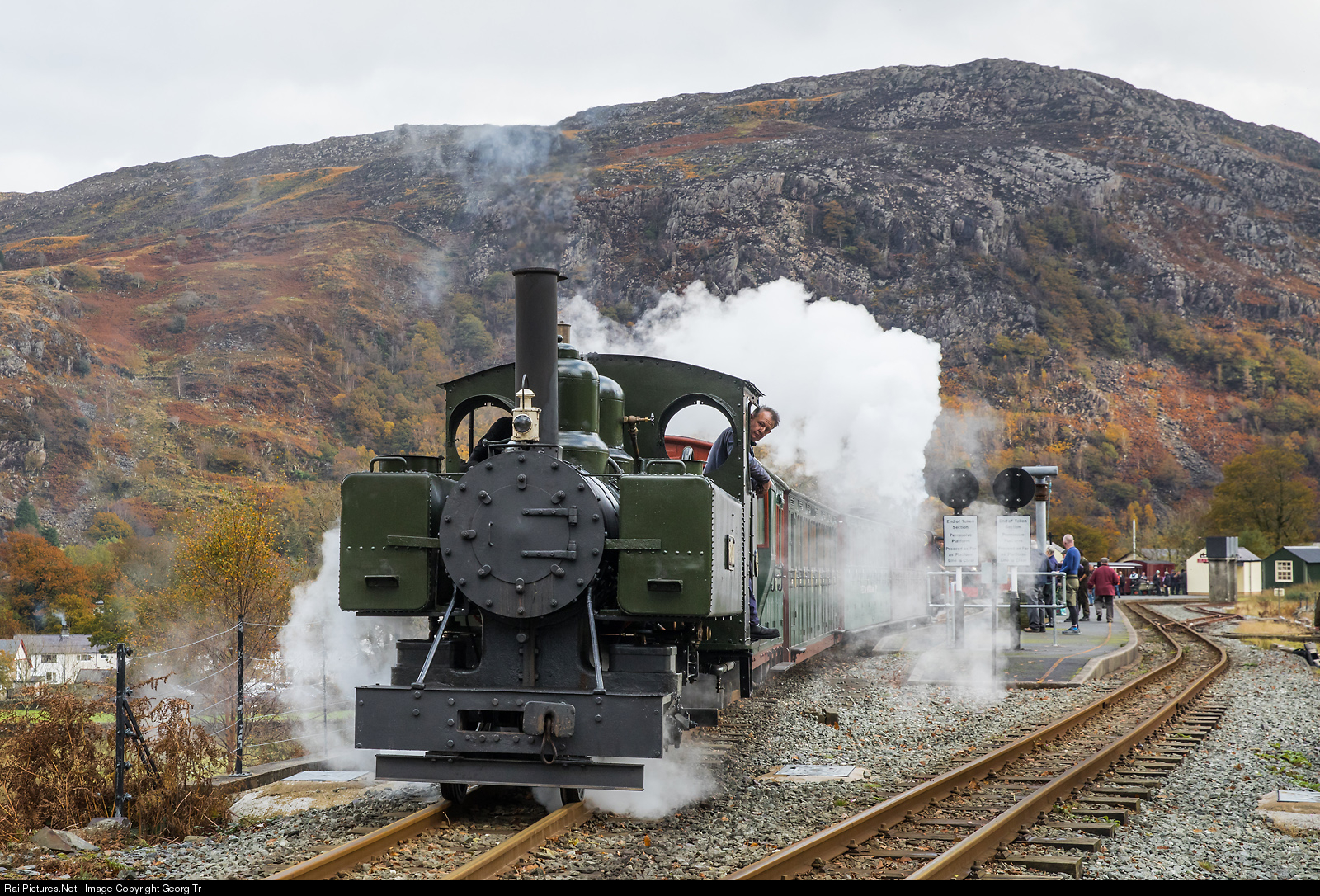 Baldwin built 4-6-0 T pannier tank steam locomotive # 608 (privately owned) on the Welsh Highland Railway in Beddgelert during a photo charter. This Class 10-12-D was built by the Baldwin Locomotive Works (USA) for the British War Department Light Railways for service in France during World War I in 1916/17. When the Great War broke out in August 1914 the French lost most of their locomotive building capacity in the Northern France to German occupied area. Therefore, the French Army demanded fast replacement of the locomotive building capacity for their useful 2′C n2t type which had proved to be a reliable locomotive type for the lightly laid military railways. Three steam locomotive type drawings were sent to Baldwin Works (finance guaranteed by the French Government) for production of C n2t, 2′C n2t, and light Mallet B′B n4v for 600 mm (1 ft 11 5⁄8 in) gauge lines. With the usual American liberty, Baldwin Drawing Office produced their "version Americaine" of these locomotive types. The first C n2t (based to Decauville design) came out in November 1914 and the first batch of 2′C n2t in January 1915. Only two more batches were built for the French. The British War Office decided to adopt the type as its principal military steam locomotive, and Baldwin started production in 1916, building 495 locomotives between October 1916 and April 1917. All were delivered except for nine which were lost at sea. After WW I many of this locomotives were exported to India. Four Baldwin Class 10-12-D locomotives have been preserved in the UK, all of which had been imported from India: # 608 was repatriated along with 44657 in 2013, currently visiting the Welsh Highland Railway. On this day the locomotive pulled the first official train after rebuilding.