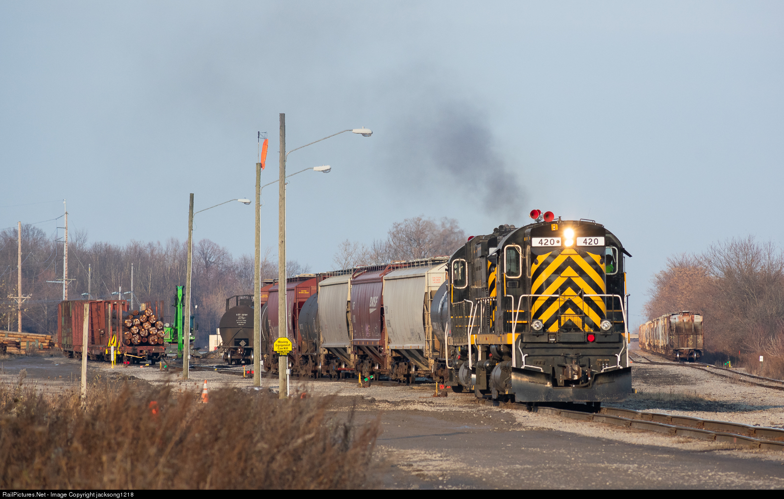 Livonia Avon anf Lakeville high hood ALCo C420 number 420 backs the Lakeville - Brooks Ave yard interchange into Brooks Ave yard to drop off a cut of cars.
