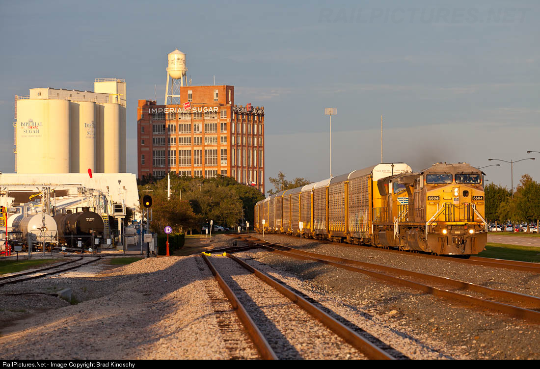 | A Houston to Laredo/KCSM empty autorack repo catches the last rays of light, passing the old Imperial Sugar Refinery. As you can see, the town has way more character than the country-ish band of the same name. |