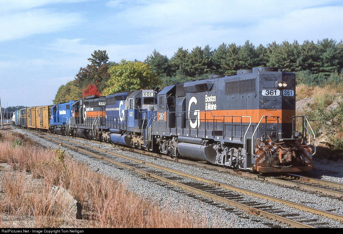 This was an odd one. From front to back we have a backwards-running Boston & Maine GP39-2, a Maine Central (ex-Detroit Edison) SD40, a Springfield Terminal SD26, and a Boston & Maine GP38-2. The eastbound freight has just diverged from the Fitchburg mainline onto the Stony Brook Branch at Willows interlocking in Ayer, MA.