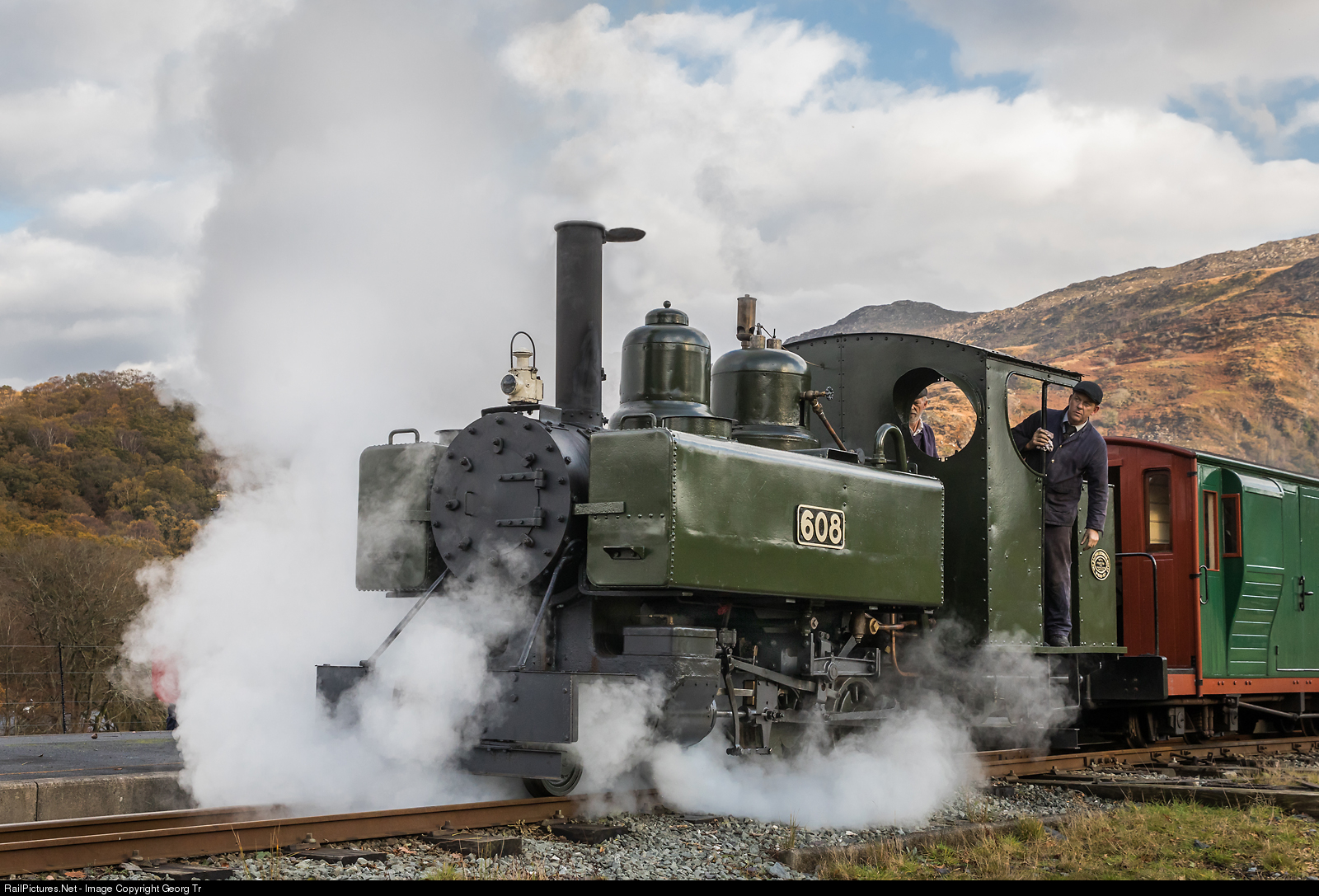 Privately owned Baldwin built 4-6-0 T pannier tank steam locomotive # 608 on the Welsh Highland Railway in Beddgelert during a photo charter. This Class 10-12-D was built by the Baldwin Locomotive Works (USA) for the British War Department Light Railways for service in France during World War I in 1916/17. When the Great War broke out in August 1914 the French lost most of their locomotive building capacity in the Northern France to German occupied area. Therefore, the French Army demanded fast replacement of the locomotive building capacity for their useful 2′C n2t type which had proved to be a reliable locomotive type for the lightly laid military railways. Three steam locomotive type drawings were sent to Baldwin Works (finance guaranteed by the French Government) for production of C n2t, 2′C n2t, and light Mallet B′B n4v for 600 mm (1 ft 11 5⁄8 in) gauge lines. With the usual American liberty, Baldwin Drawing Office produced their "version Americaine" of these locomotive types. The first C n2t (based to Decauville design) came out in November 1914 and the first batch of 2′C n2t in January 1915. Only two more batches were built for the French. The British War Office decided to adopt the type as its principal military steam locomotive, and Baldwin started production in 1916, building 495 locomotives between October 1916 and April 1917. All were delivered except for nine which were lost at sea. After WW I many of this locomotives were exported to India. Four Baldwin Class 10-12-D locomotives have been preserved in the UK, all of which had been imported from India: # 608 was repatriated along with 44657 in 2013, currently visiting the Welsh Highland Railway. On this day the locomotive pulled the first official train after rebuilding. Another locomotive of the same class, the # 794 is undergoing contract restoration at the Vale of Rheidol Railway workshop in Aberystwyth and will run as ("replica") # 590 for the Welsh Highland Heritage Railway. The original # 590 of the Welsh Highland Railway, which ran in the 1920'/1930', was scrapped in 1942.