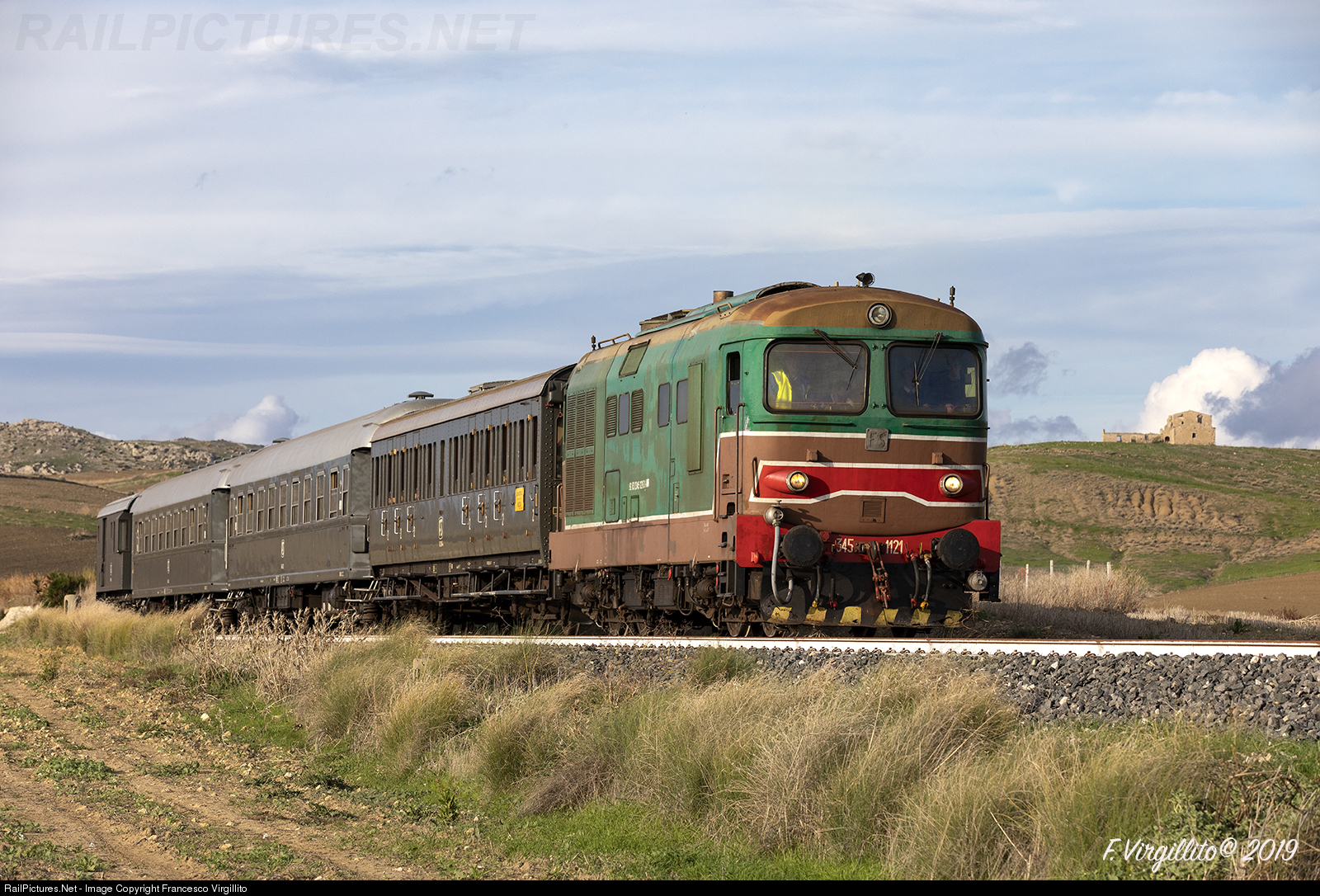 | Photo train organized by the "ITALY ON RAIL" association, on the Canicatti-Gela line, composed of a diesel-elettric locomotive type D345 and 4 vintage wagons. |