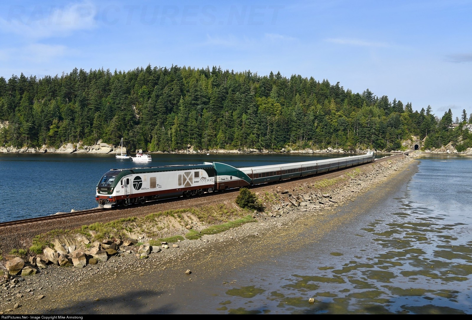 Across the Bay: Amtrak train number 517 cuts across a causeway that runs right through the middle of Chuckanut Bay on BNSF Railway's Bellingham Subdivision. The locomotive is leading the train south, which is somewhat unusual. However, what's even more out of the ordinary is the lack of a cab car at the north end of the train.