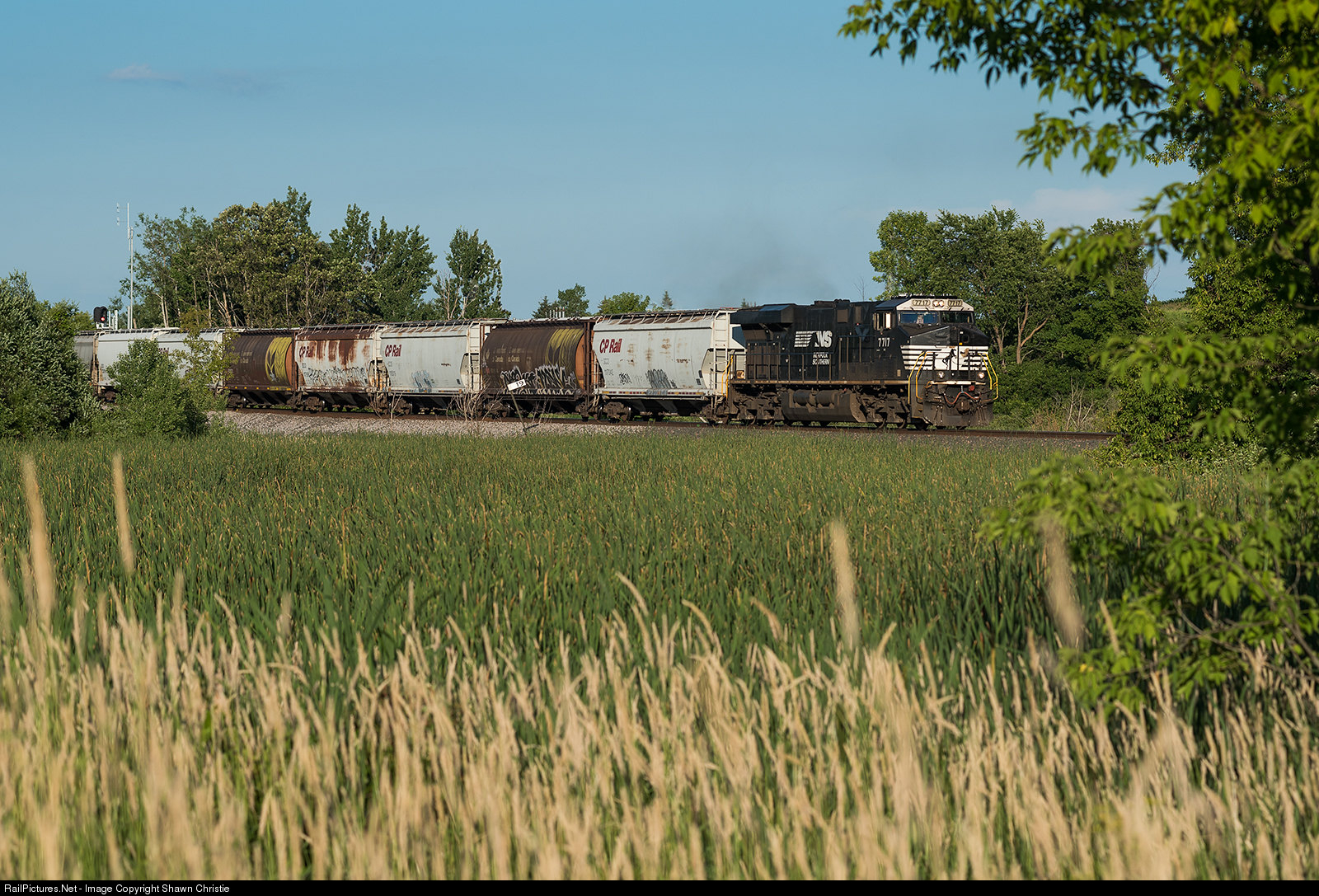 NS 7717 leads a westbound on the CP Paynesville sub. The longs days of summer allow for some shots from the north side of the tracks. Power lines have been removed, no PPE required.