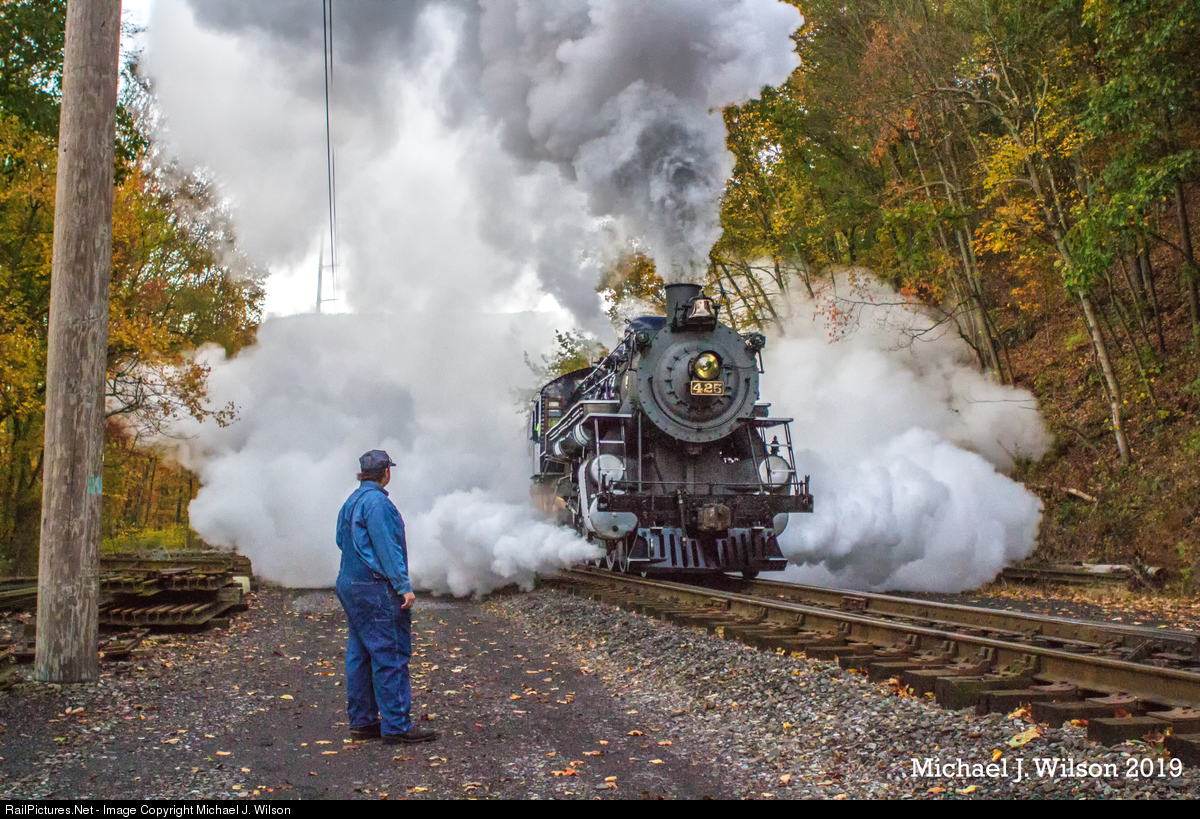 | "Anticipation": Fireman Ryan Frederickson manned the switch outside of the Port Clinton steam shops on October 19, 2019 as Reading & Northern #425 gave a wake-up call to the sleepy railroad town along Route 61. |