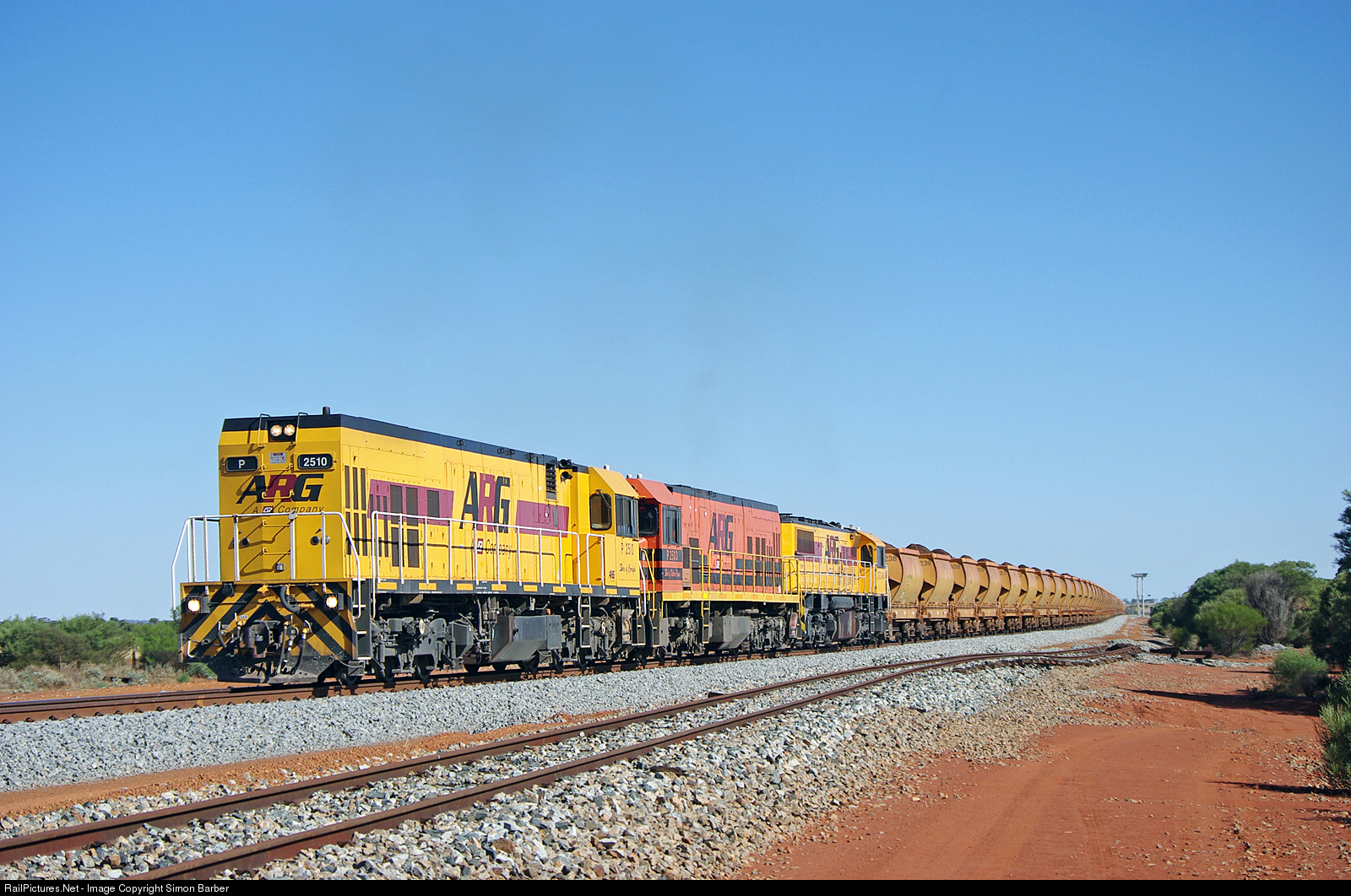| P2510, P2503 and DFZ2405 depart the loop at Bell with a loaded Mt Gibson iron ore train. |