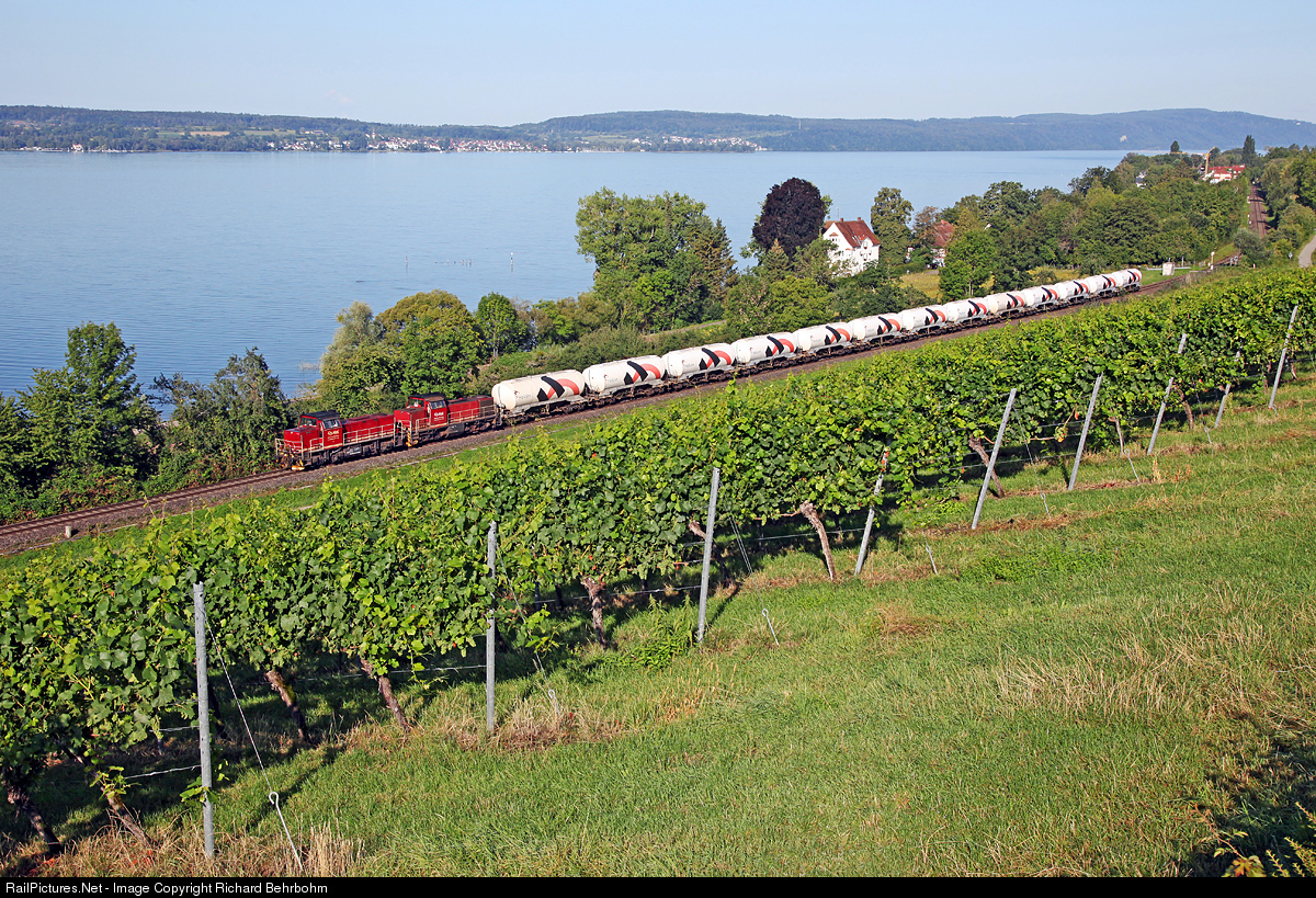 | HzL V 124 and V 152 are pulling a diverted freight train Singen - Dotternhausen along the Lake Constance. |