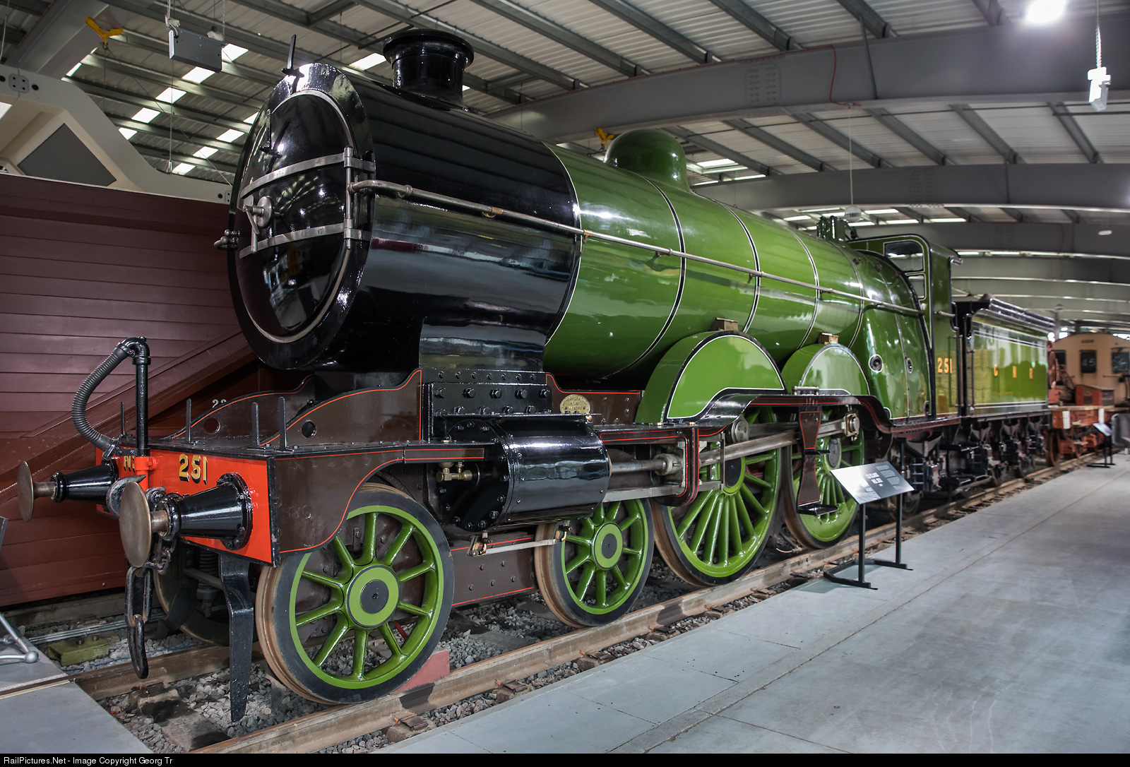 4-4-2 steamlocomotive # 251 of the Great Northern Railway (GNR) in the Shildon Locomotion museum, designed by H A Ivatt, built at Doncaster in 1902, withdrawn in 1947. It inaugurated the ‘big engine’ era on the East Coast route, and the wide firebox in British Express locomotives. From World War I to the late 1930s, the superheated large-boilered Atlantics performed much of their best work. They sometimes tackled very heavy trains and achieved particular fame on the various Pullman trains of the period.