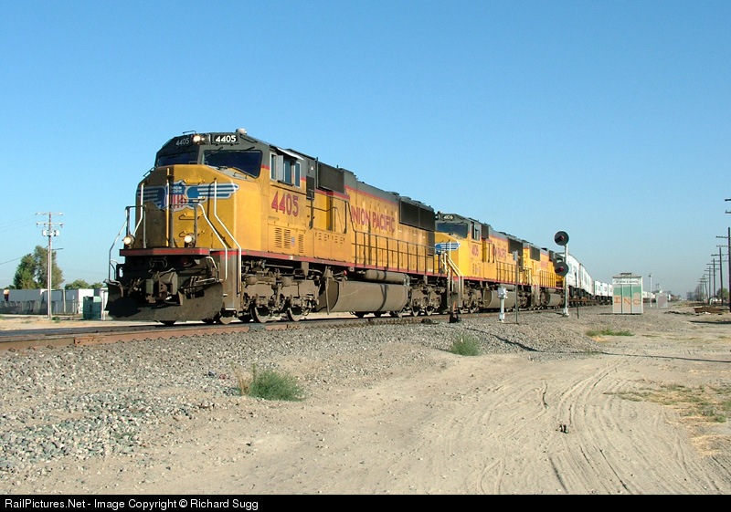 | UP 4405 leads a southbound Z-train out of the siding at Goshen, between Tulare and Fresno on UP's Fresno Sub. |
