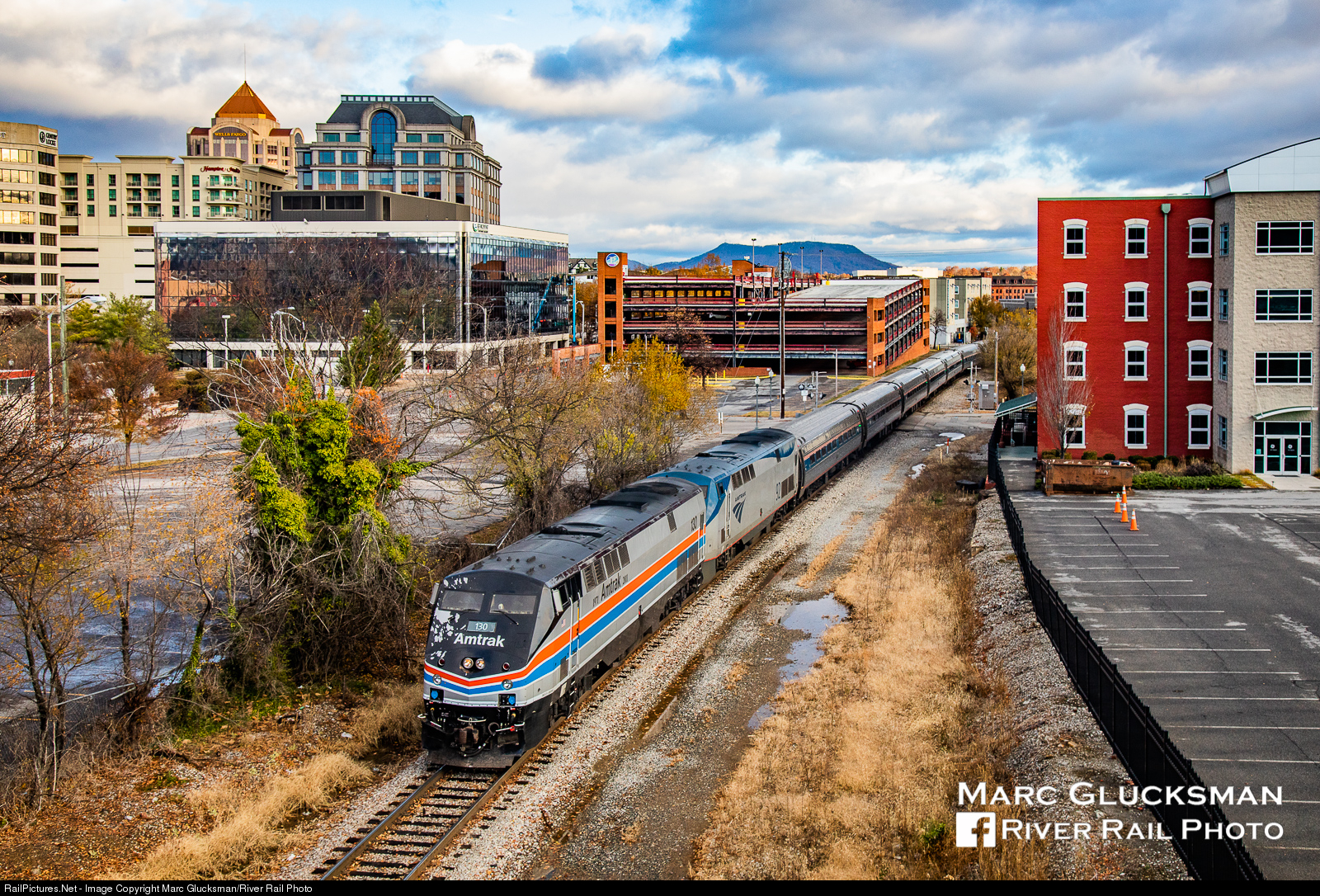 Amtrak Regional 156 backs down Williamson Road SE in Roanoke, VA on the morning of Sunday, November 24, 2019 withP42DC 130 (Phase II) pushing as it approaches the Amtrak Roanoke Station.