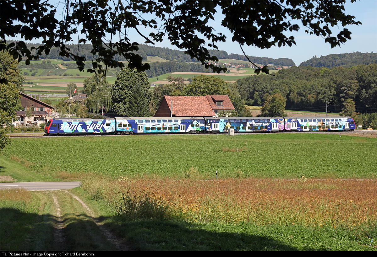 | Since march 2019 this double deck commuter trainset (DPZ) of the S-Bahn Zürich has a a new publicity paint scheme "Zäme Züri" (Zurich together). The train is running the S 33service Winterthur - Schaffhausen. |