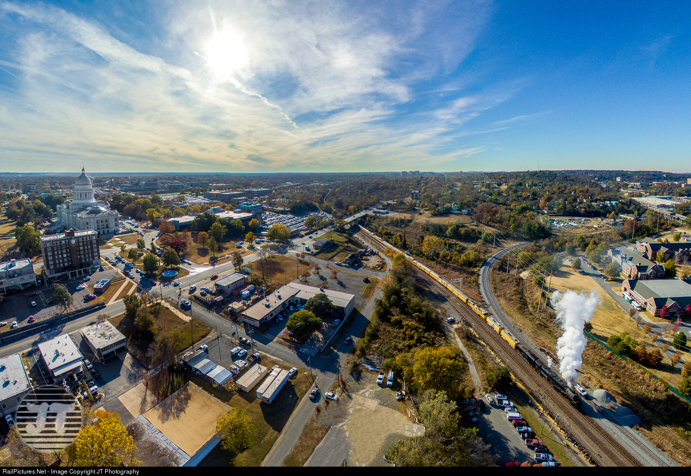 | Welcome to Little Rock. With hundreds waiting on the platform, UP 4014 crawls east into the Little Rock Union Station with the State Capitol building in the background. The Arkansas State Capitol was based off of the U.S. Capitol Building and due to their similarities, in many movies the Arkansas State Capitol gets to be the stand in for the actual US Capitol. Sharp eyes will note an EB BNSF Oil train in the background that has been crossed against the current of traffic to allow 4014 to pass. The sharp turn on the right is the Little Rock & Western Railway (now a part of the G&W). |