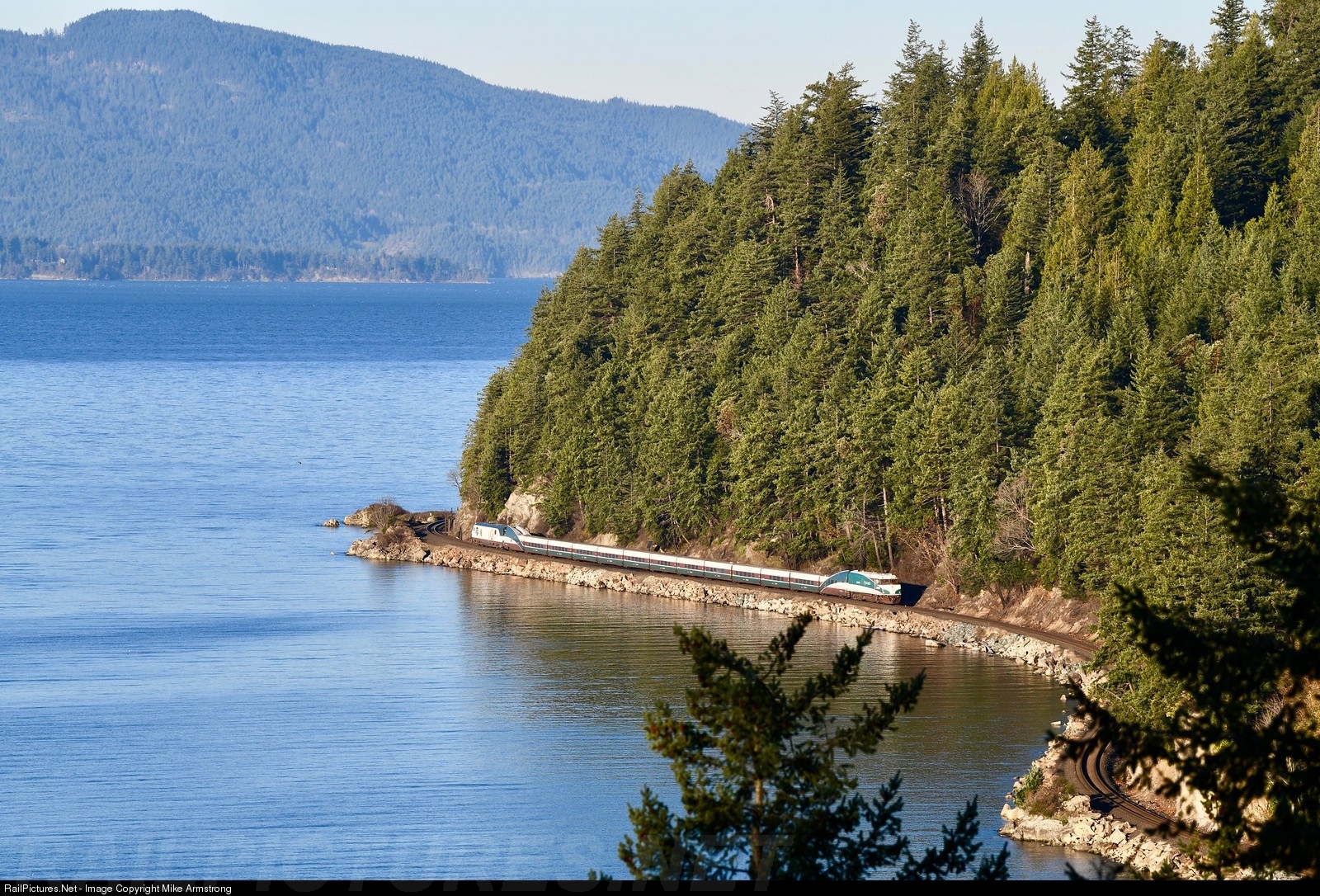| Cascading Along the Sound: Amtrak train 517 rolls along the water's edge of Puget Sound as it nears Samish. In short order, the train will turn inland to pass through the farmland of the Skagit Valley. |