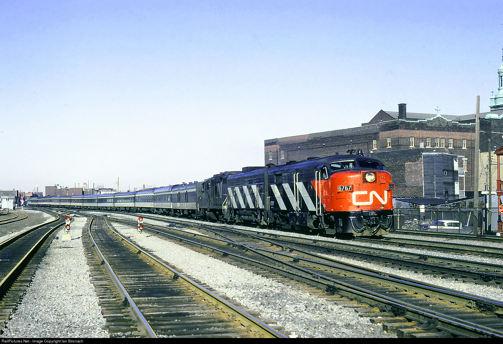 A late afternoon, thirteen car passenger train bound for Toronto, lead by an FPA-4, F9B and a GP-9, approaches the Decourcelle Street crossing in the St. Henri District. Decourcelle was the east end of Turcot Yard. The yard now is gone and the crossing has only three tracks.