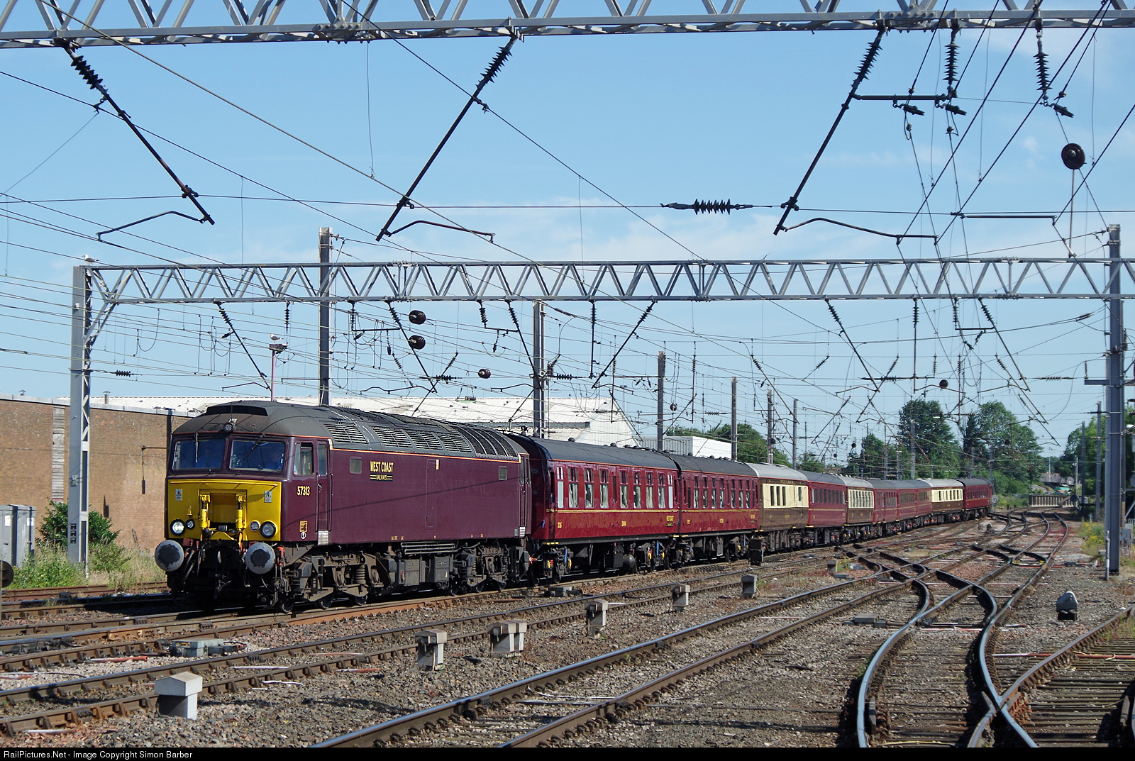 | 57313, with out of sight 47832 on the rear, bring a West Coast tour train into Carlisle. |