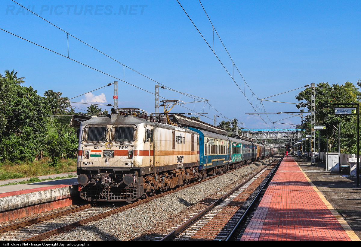 Jan Shatabdi Express with mixed carriages of different colors rips through Paravur station powered by an old ROYAPURAM WAP-7