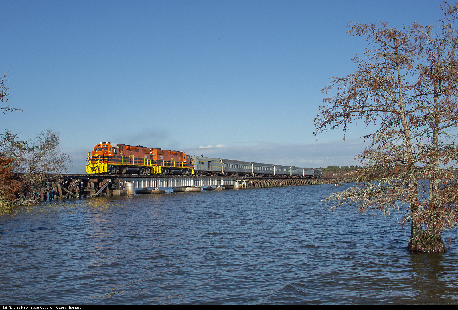 | Heart of Georgia Railroad GP38-2's 2124 and 2125 leads the 3pm SAM Shortline excursion train west towards Plains across Lake Blackshear near Cordele, Georgia. |