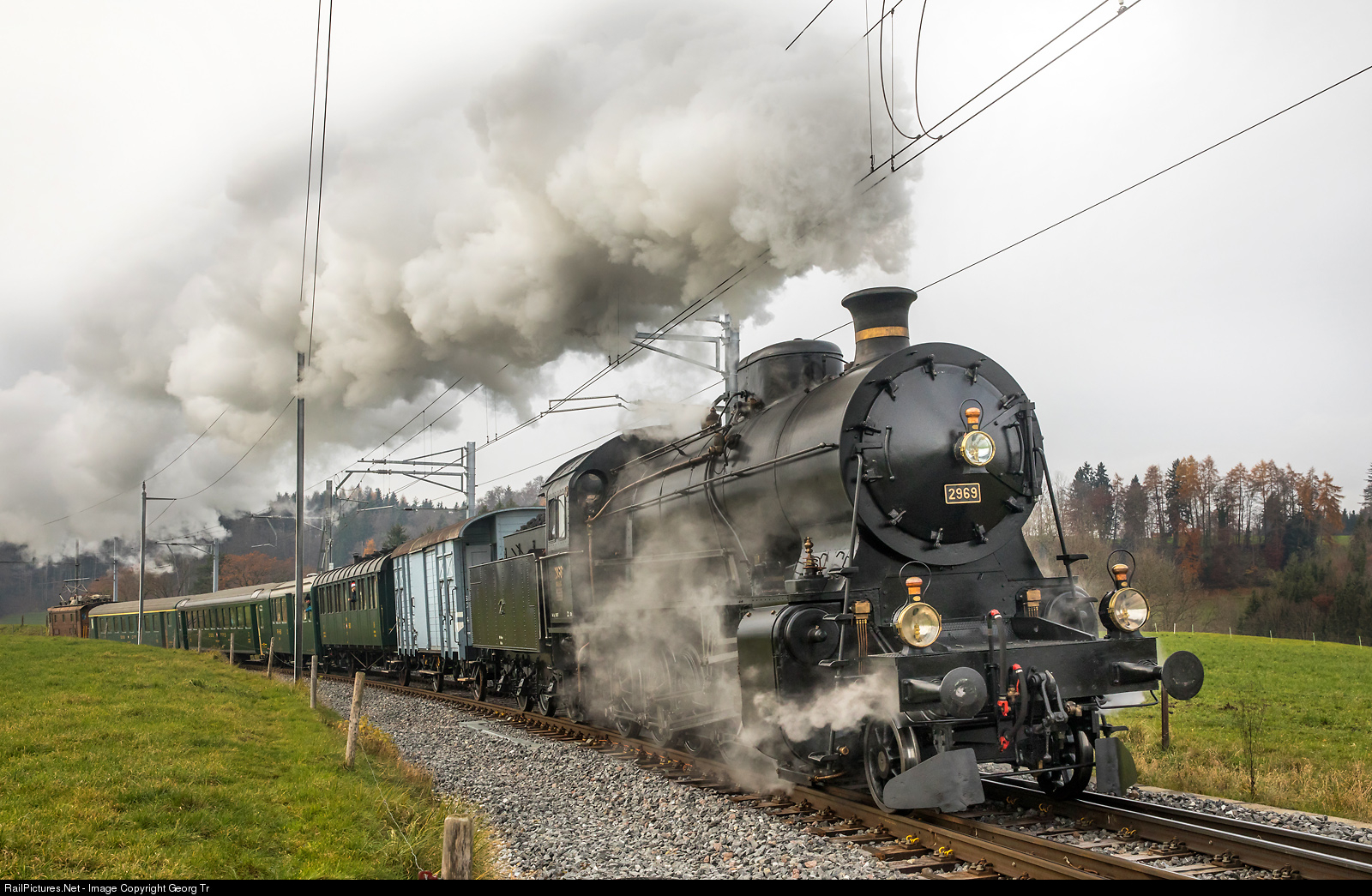 Santaclaus train of Eurovapor Sulgen from Bischofszell Nord to Hauptwil and back, with 2-10-0 Gotthard steamlocomotive C 5/6 "Elephant" # 2969 from 1916, entering Hauptwil. In the rear is electrolocomotive Be 4/4 # 14 for heating and pulling back the train.